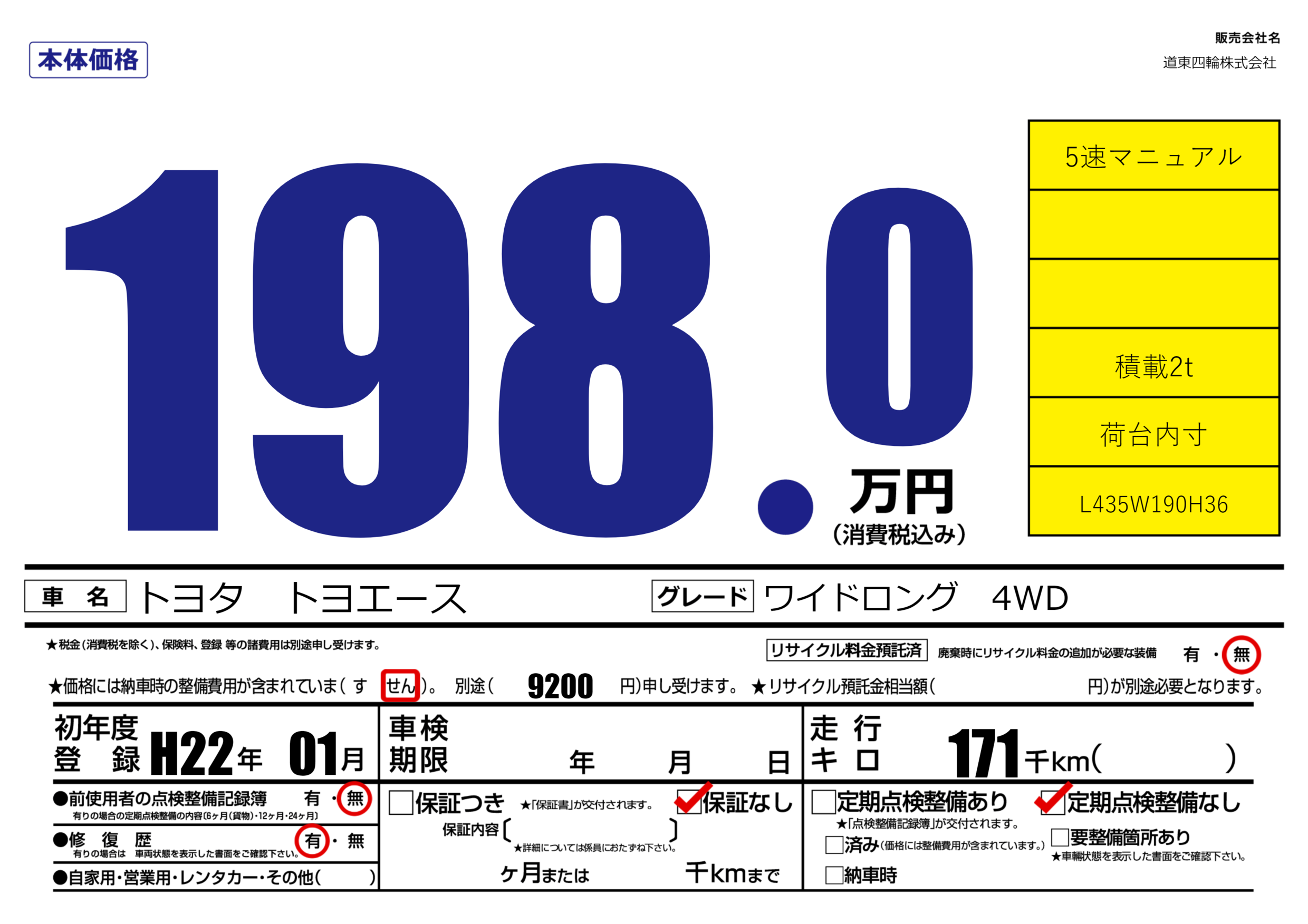 | 車名 | トヨタ トヨエース | グレード ミッション 排気量 |