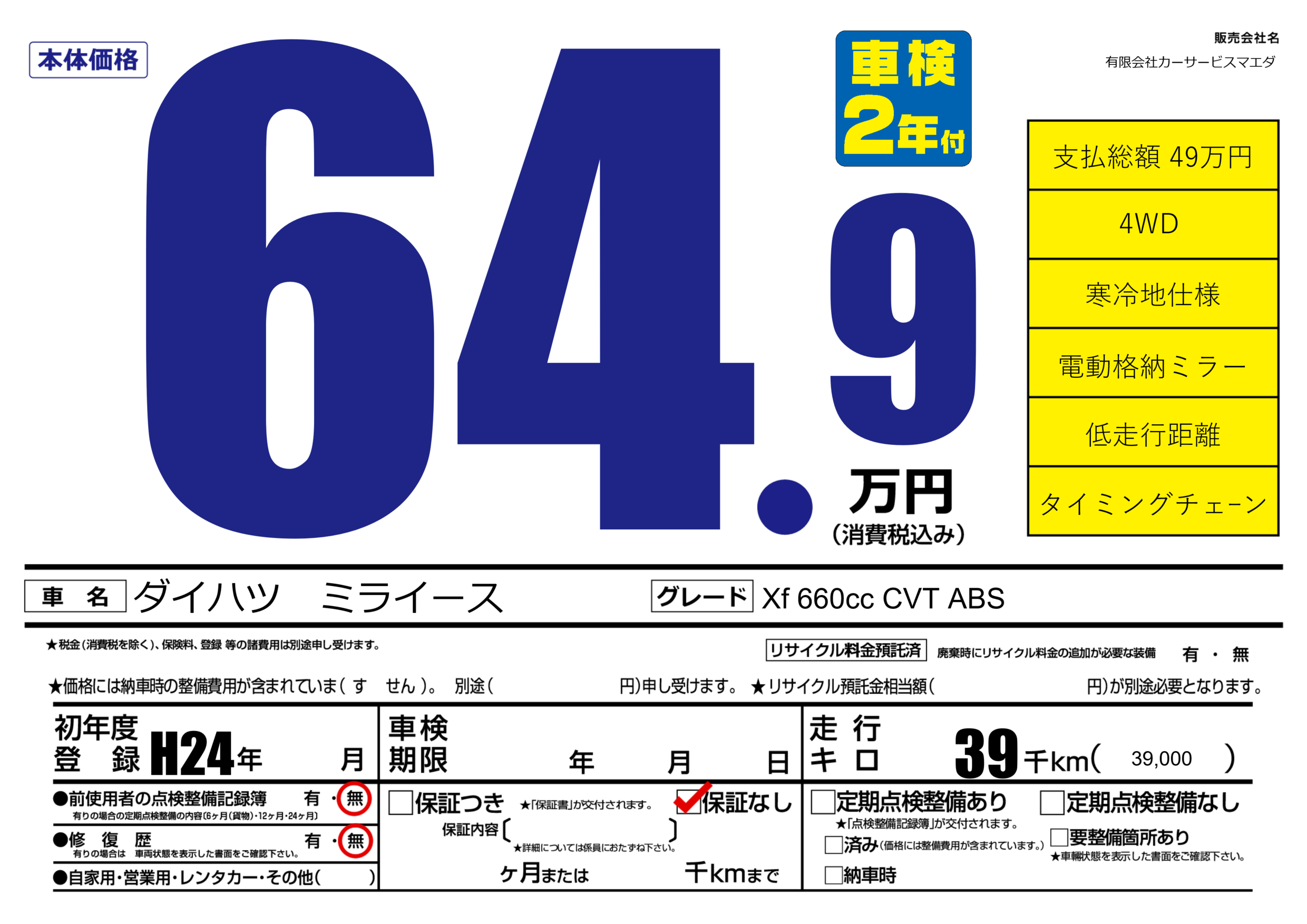 | 走行キロ | 3.9万km | 初年度登録 | H24年---月 |