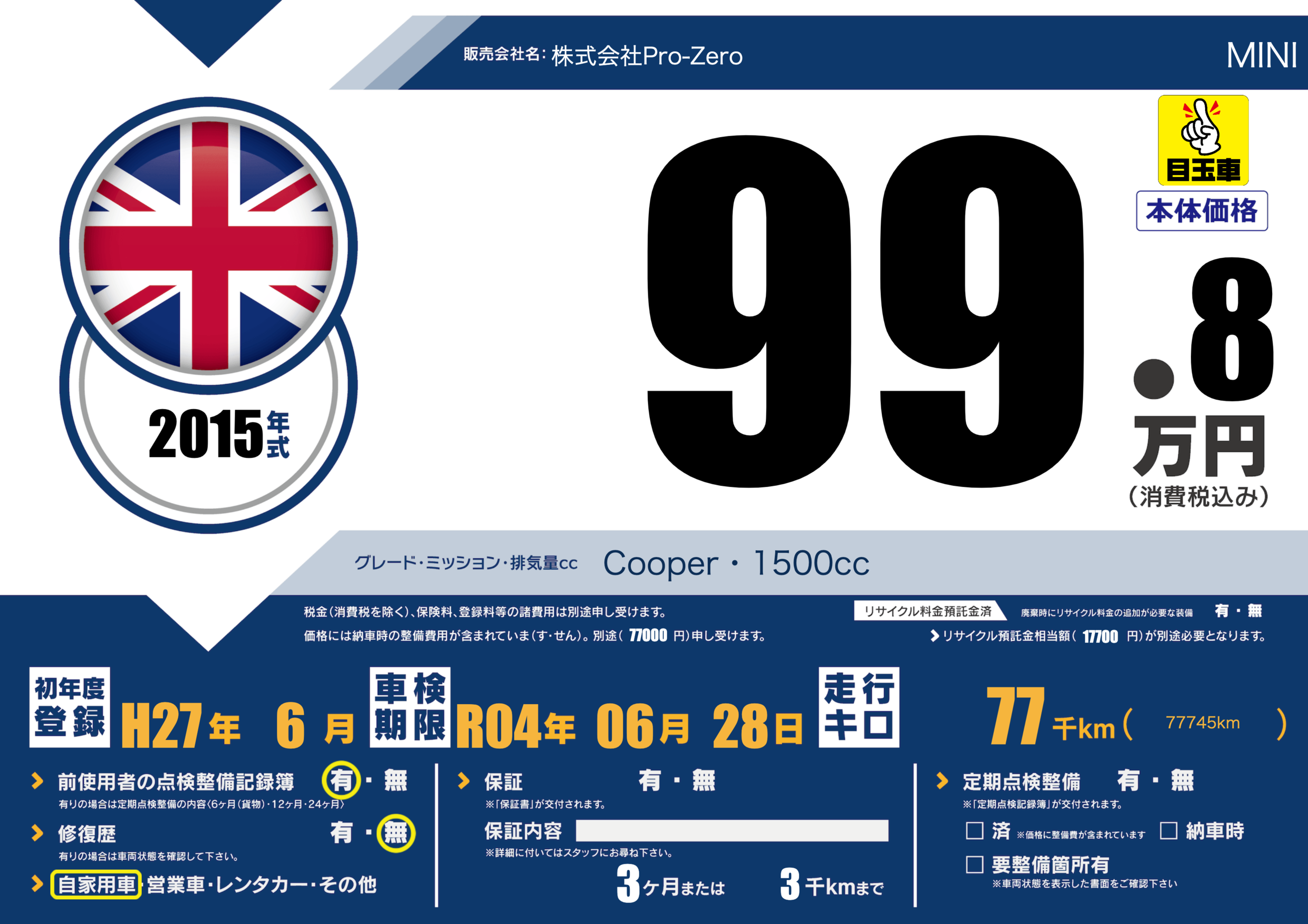 | 走行キロ | 7.7万km | 初年度登録 | H27年6月 |