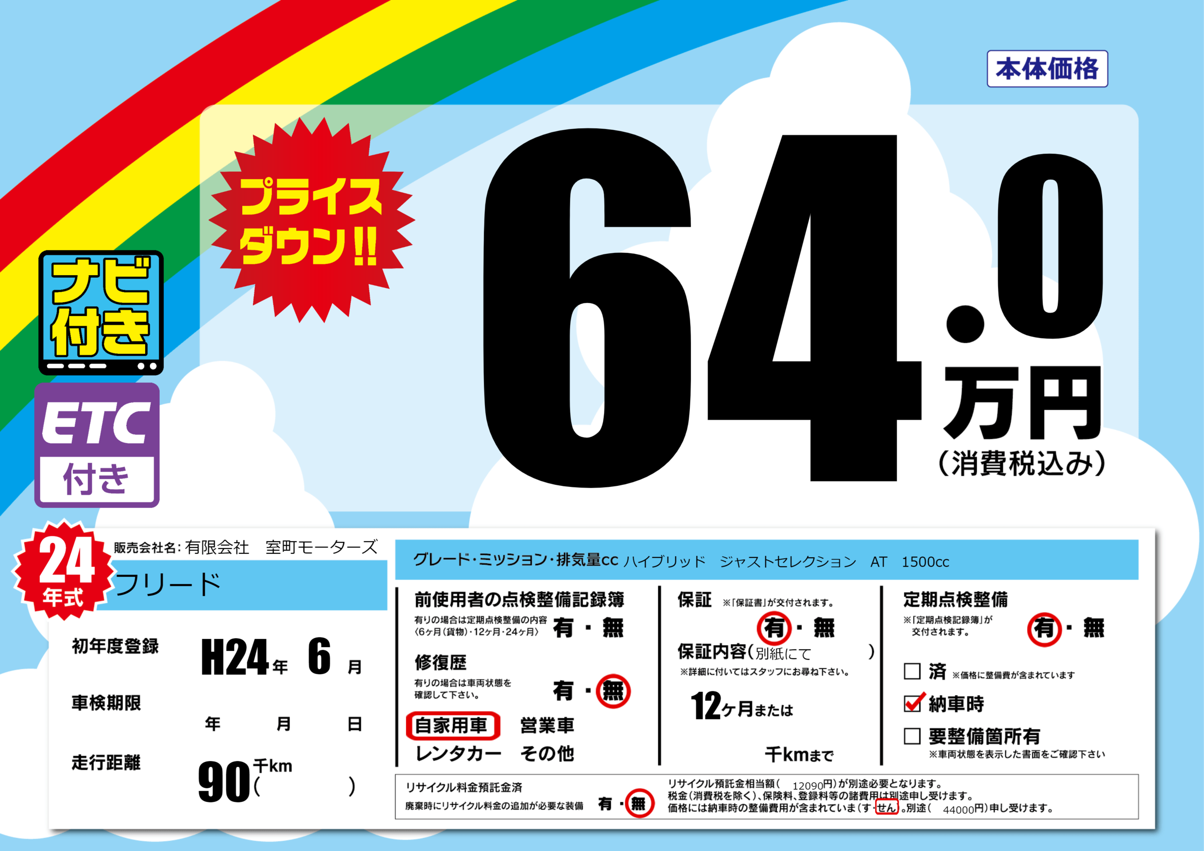 保証付き 保証内容(別紙にて) 12ヶ月または()千kmまで |