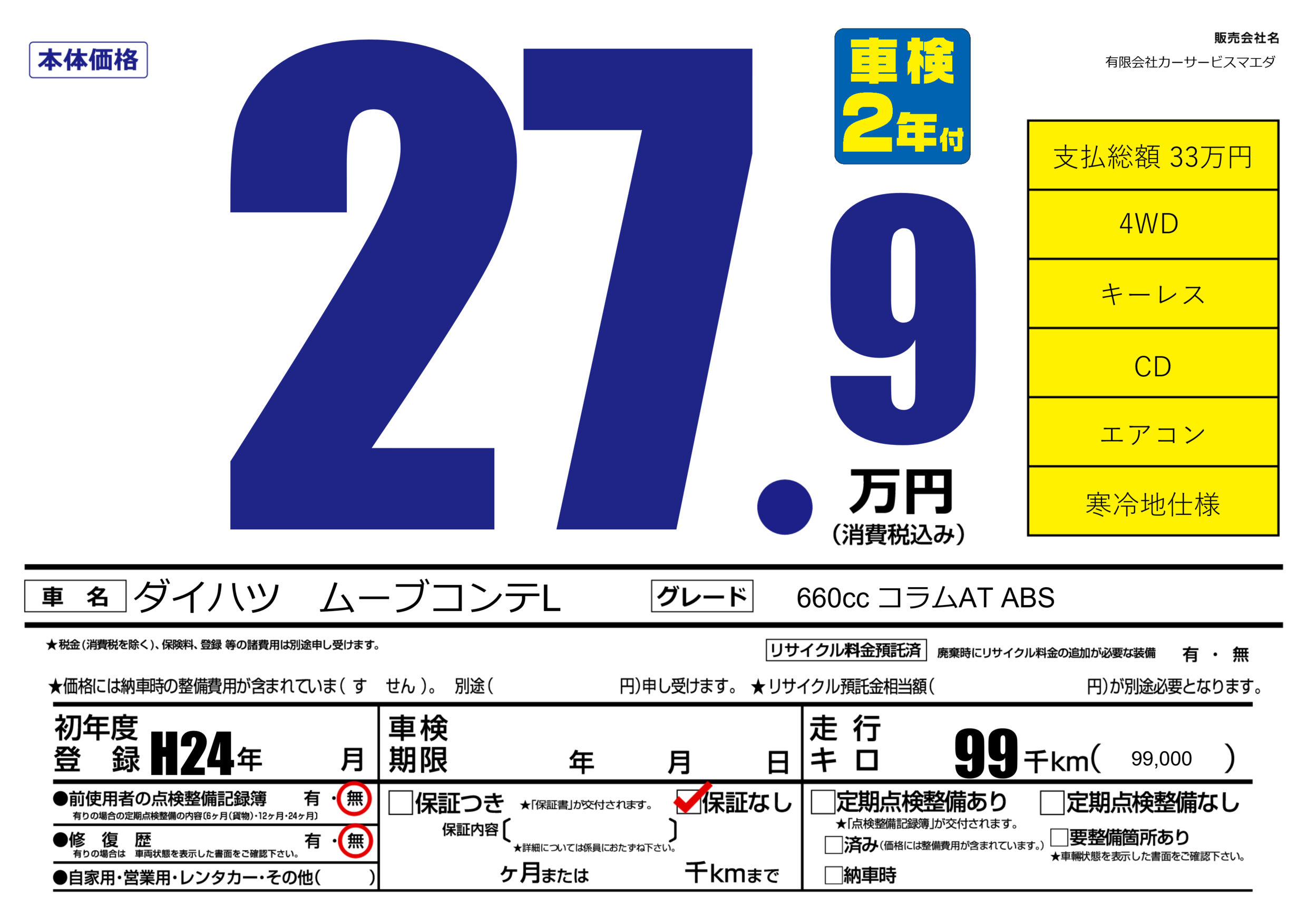 | 車名 | ダイハツ ムーブコンテL | グレード ミッション 排気量 |