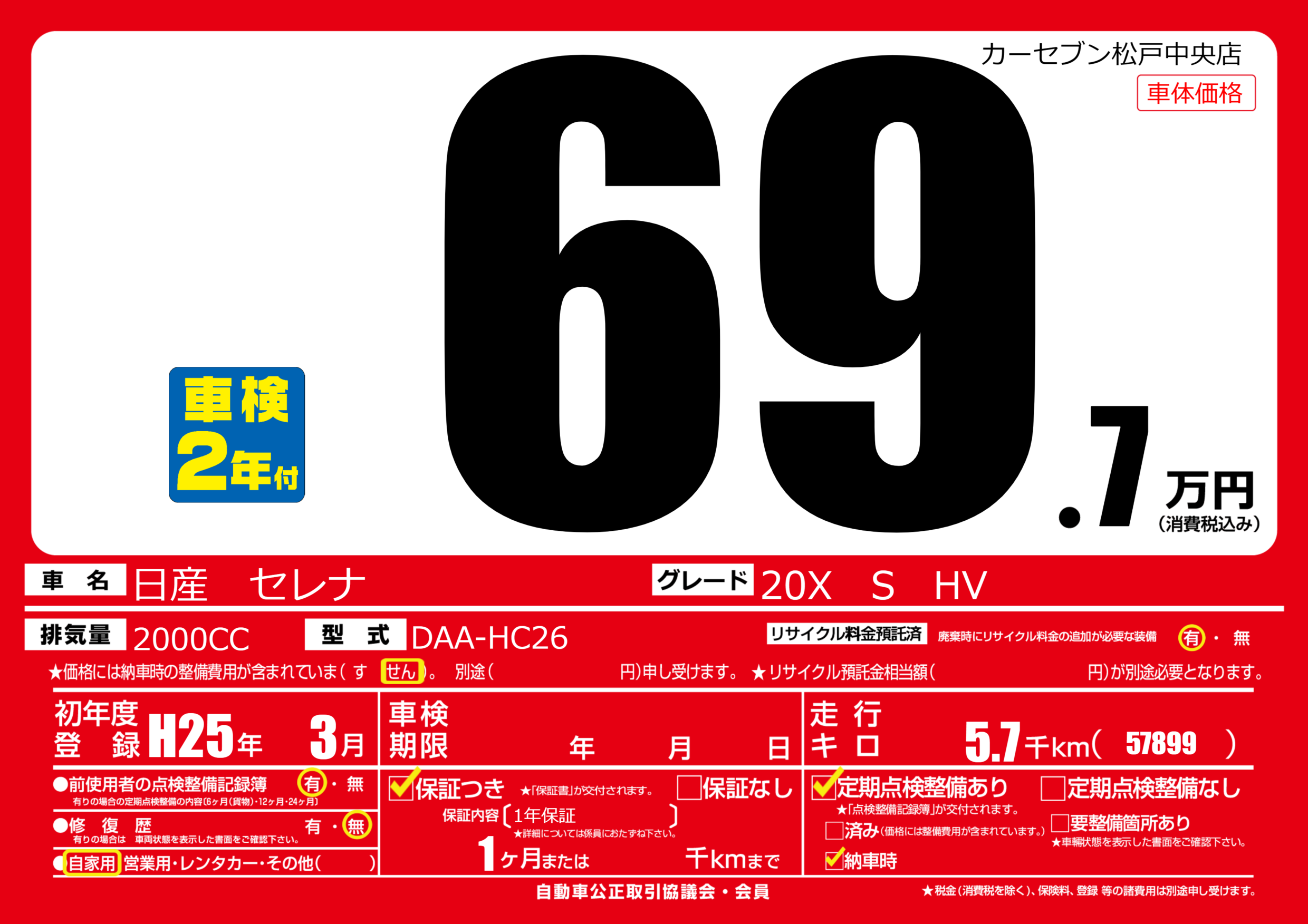| 走行キロ | 0.5万km | 初年度登録 | H25年3月 |