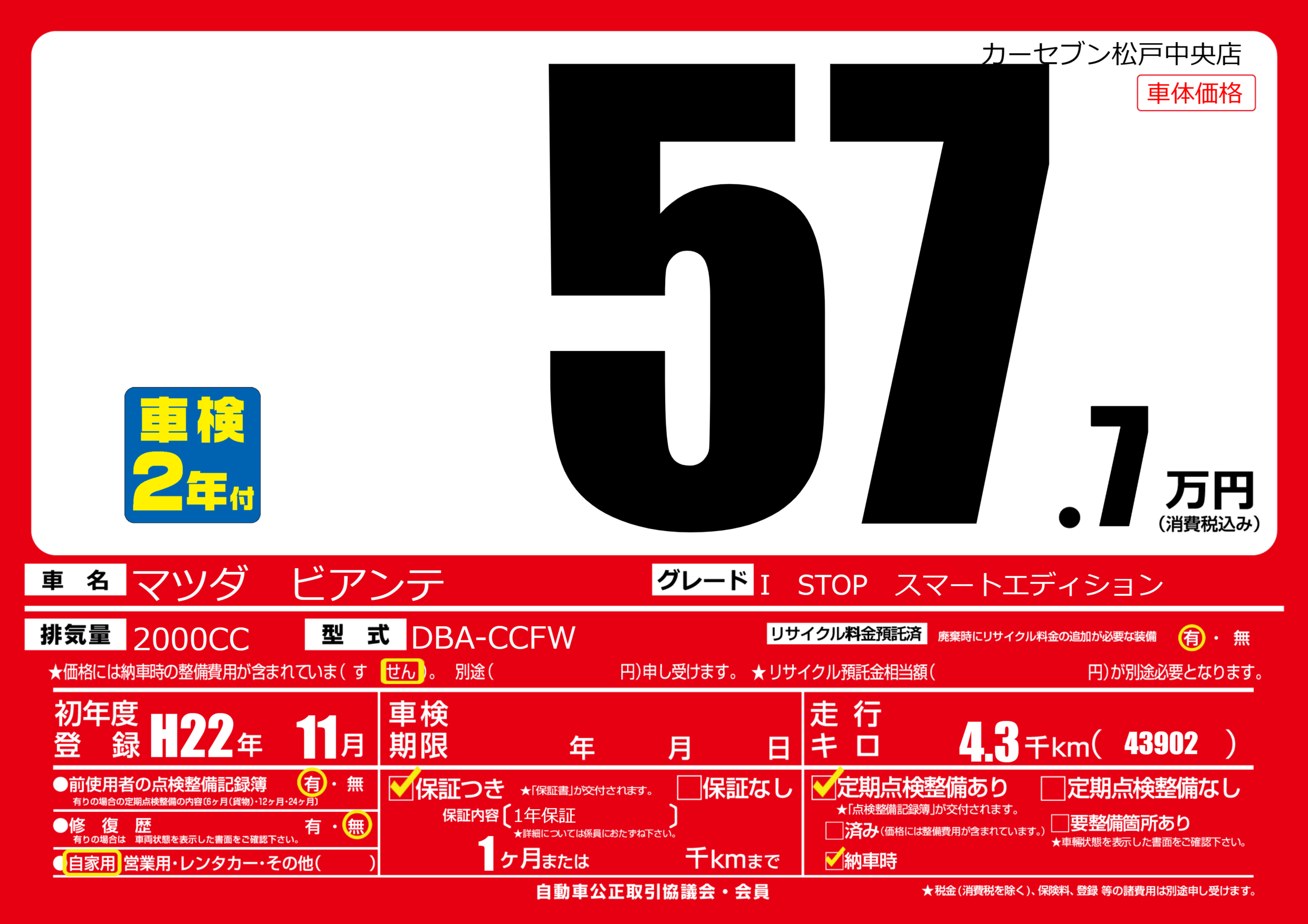 | 車名 | マツダ ビアンテ | グレード ミッション 排気量 |