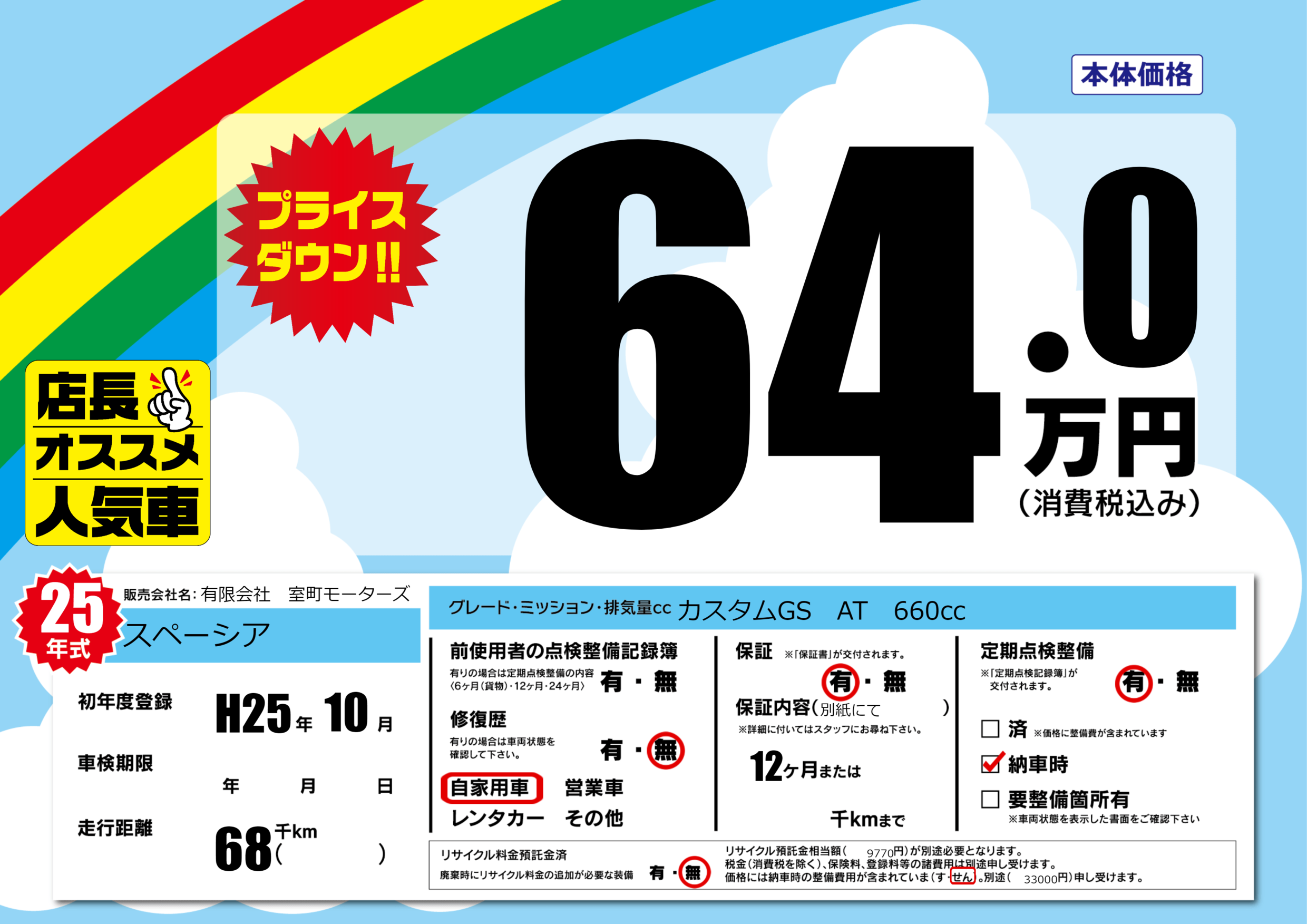 | 走行キロ | 6.8万km | 初年度登録 | H25年10月 |