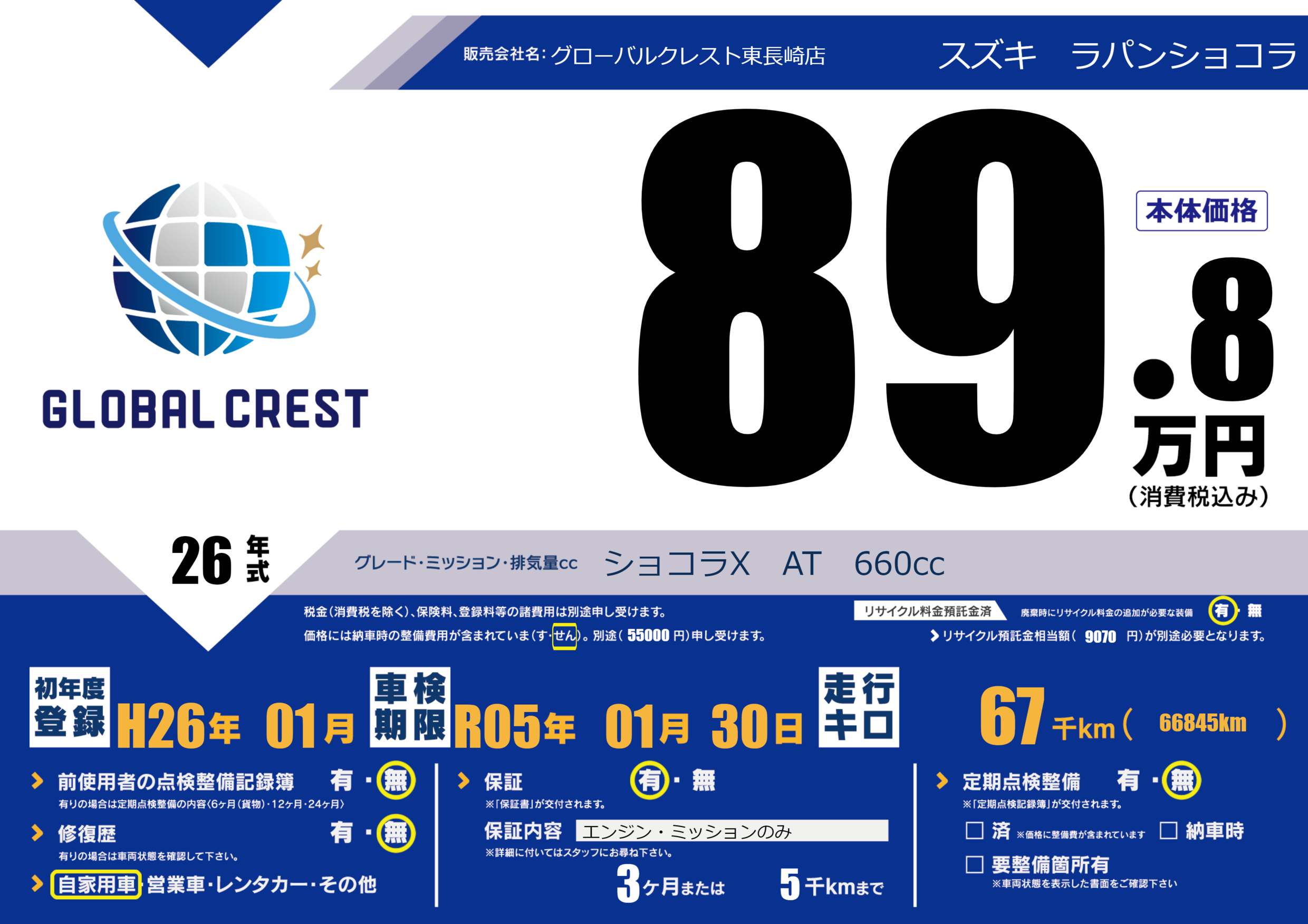 | 車名 | スズキ ラパンショコラ | グレード ミッション 排気量 |