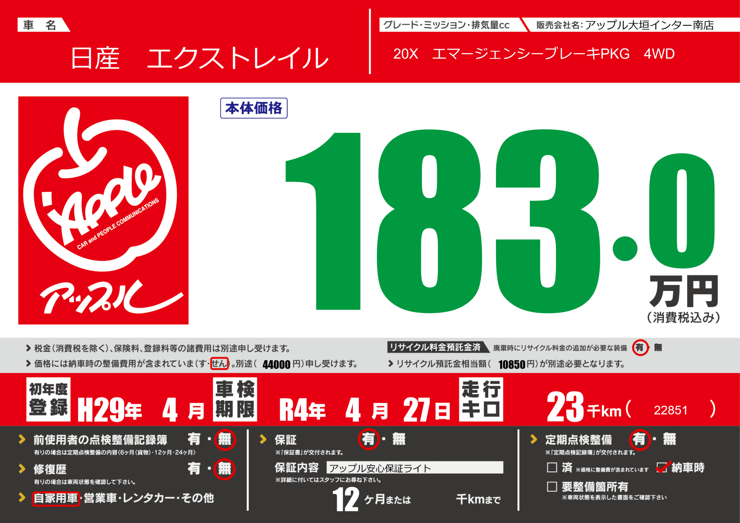 保証付き 保証内容(アップル安心保証ライト) 12ヶ月または()千kmまで |
