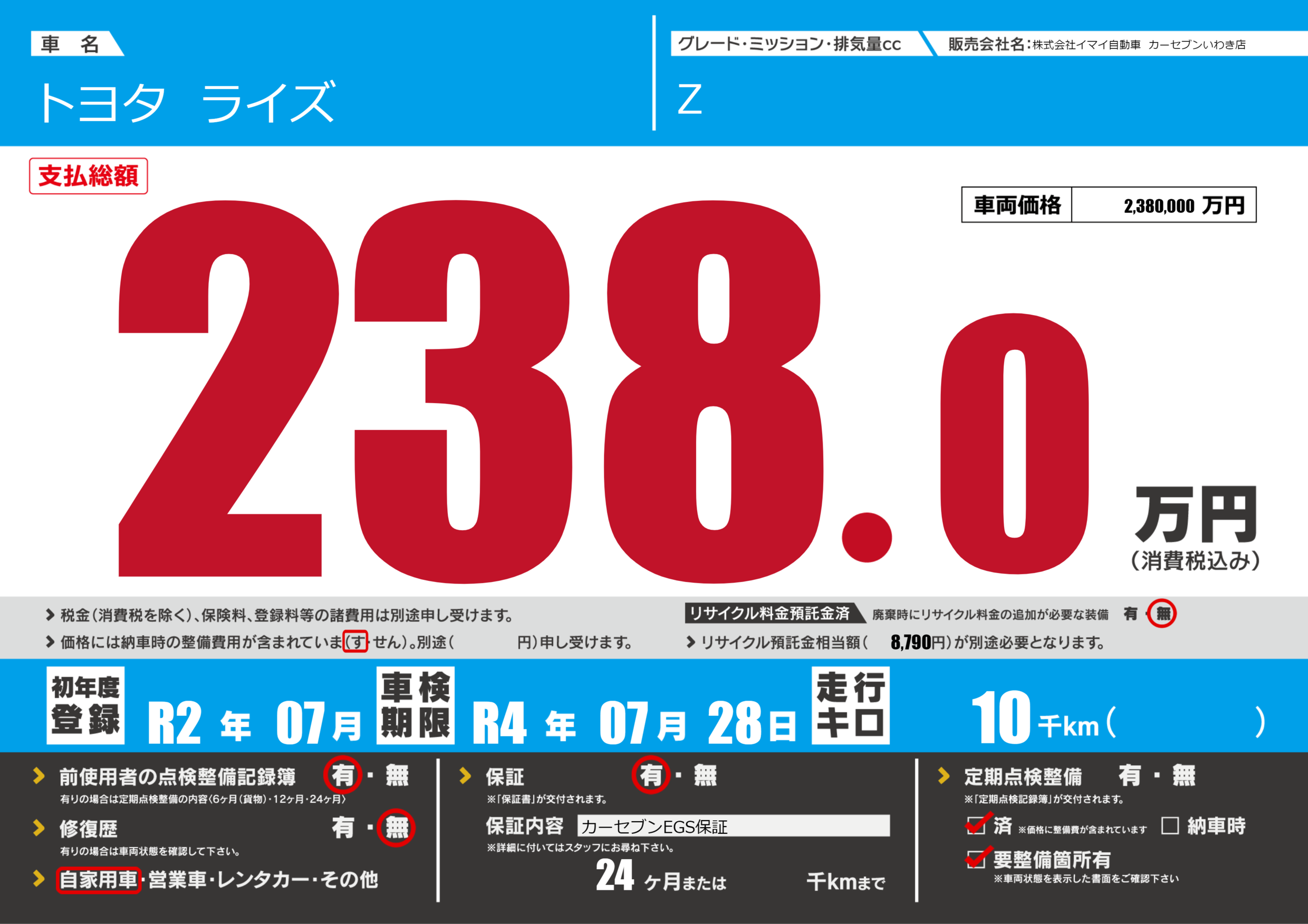 | 車名 | トヨタ ライズ | グレード ミッション 排気量 |