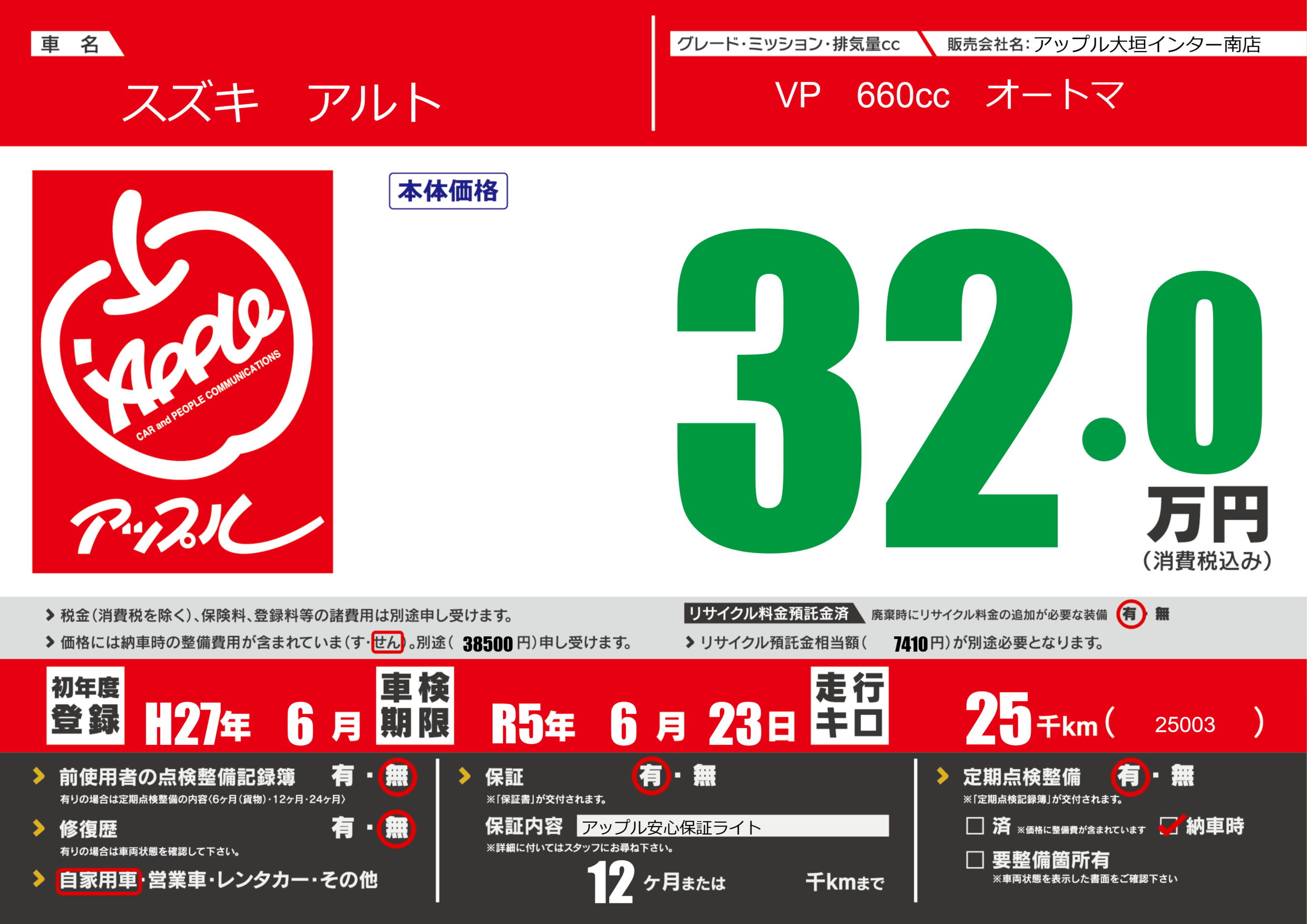 保証付き 保証内容(アップル安心保証ライト) 12ヶ月または()千kmまで |