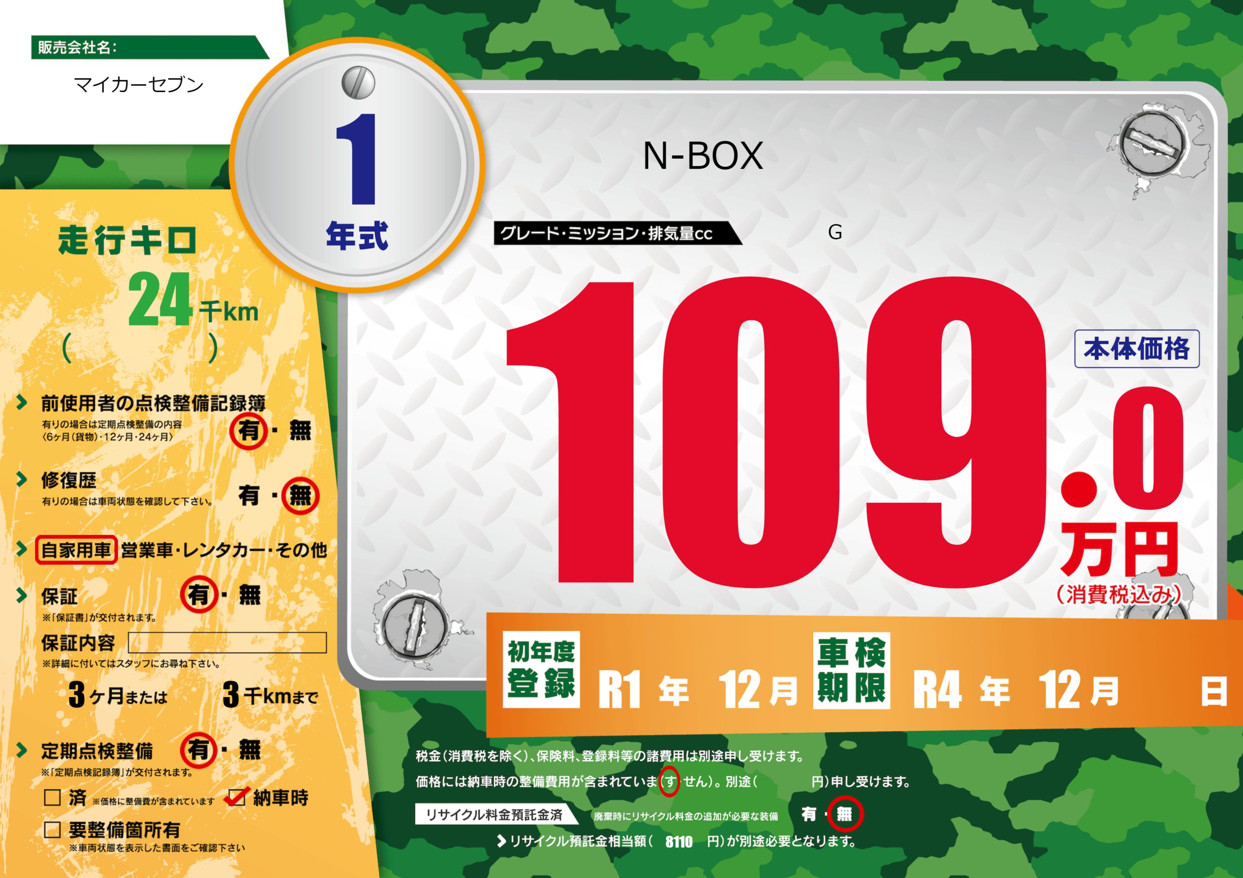 | 車名 | N-BOX | グレード ミッション 排気量 |