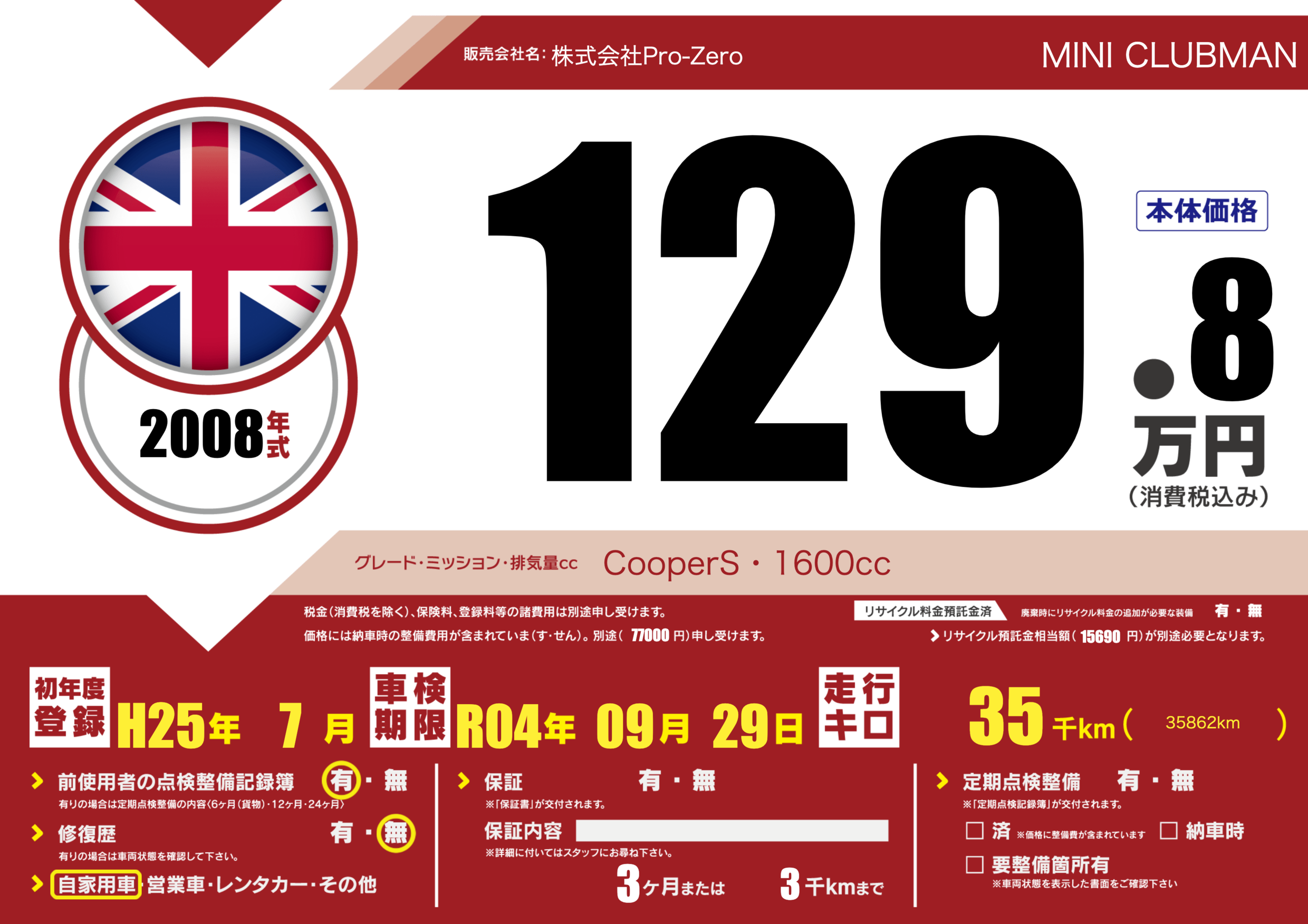 | 車名 | MINI CLUBMAN | グレード ミッション 排気量 |