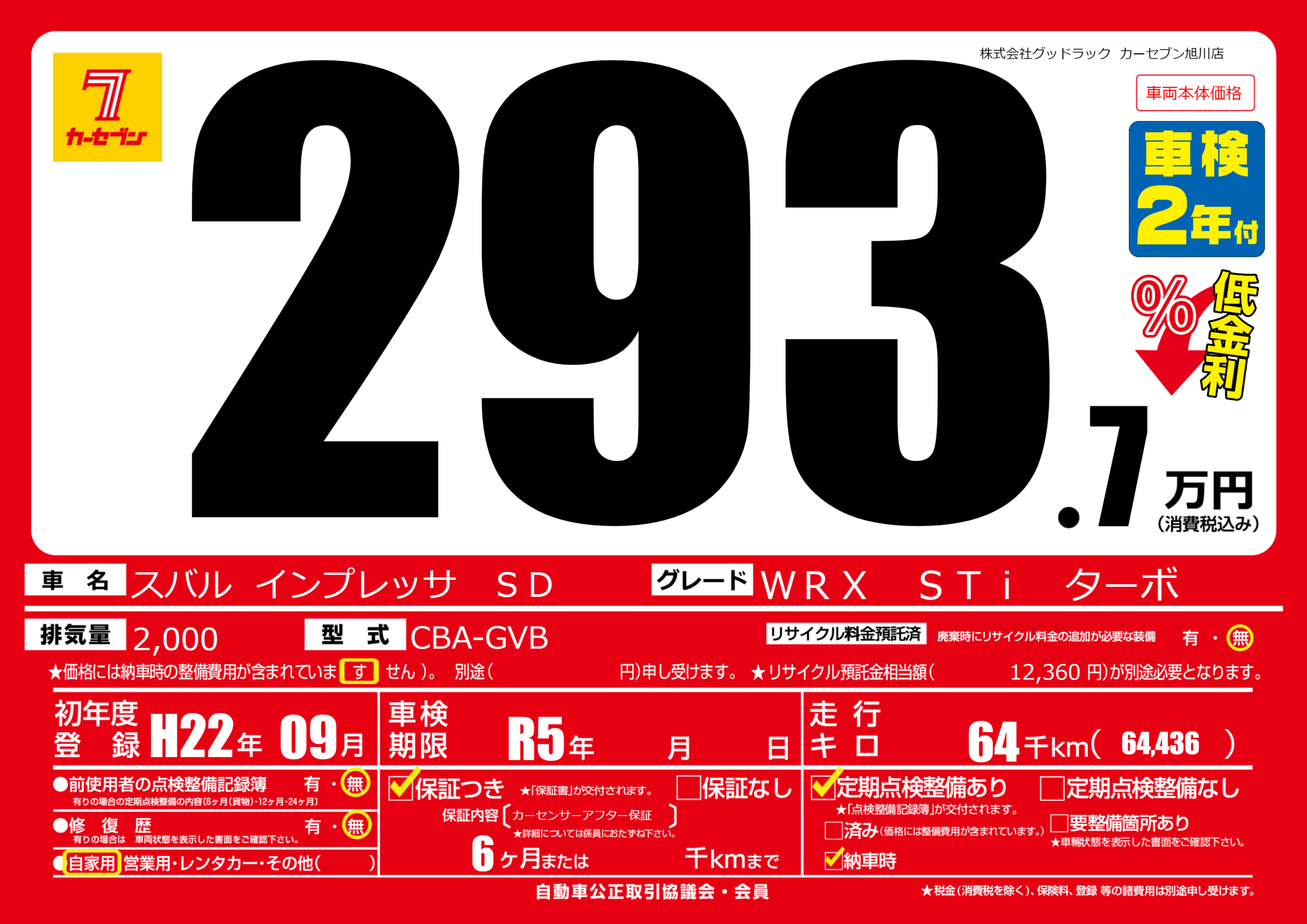 | 走行キロ | 6.4万km | 初年度登録 | H22年09月 |
