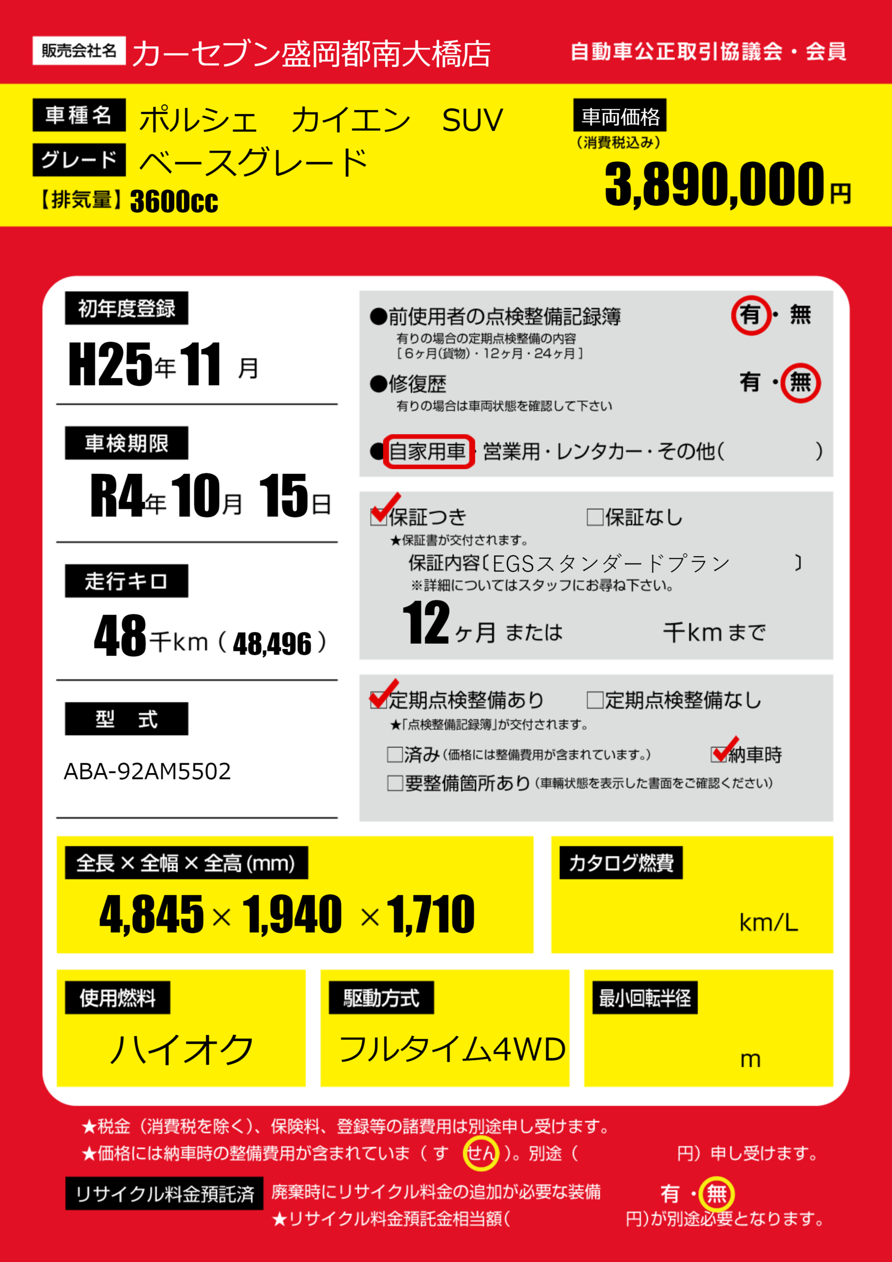 | 車名 | ポルシェ カイエン SUV | グレード ミッション 排気量 |