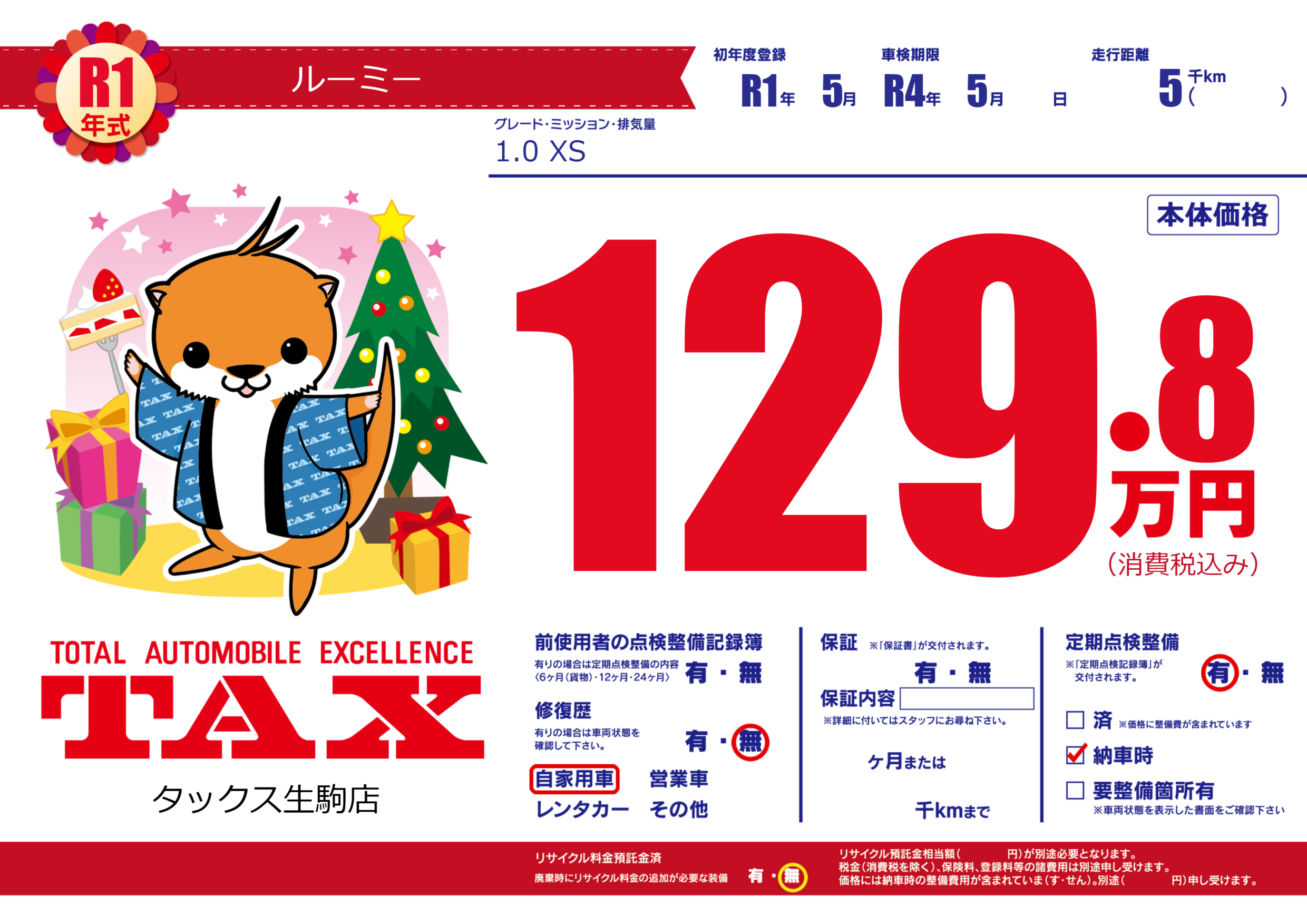 | 走行キロ | 0.5万km | 初年度登録 | R1年5月 |