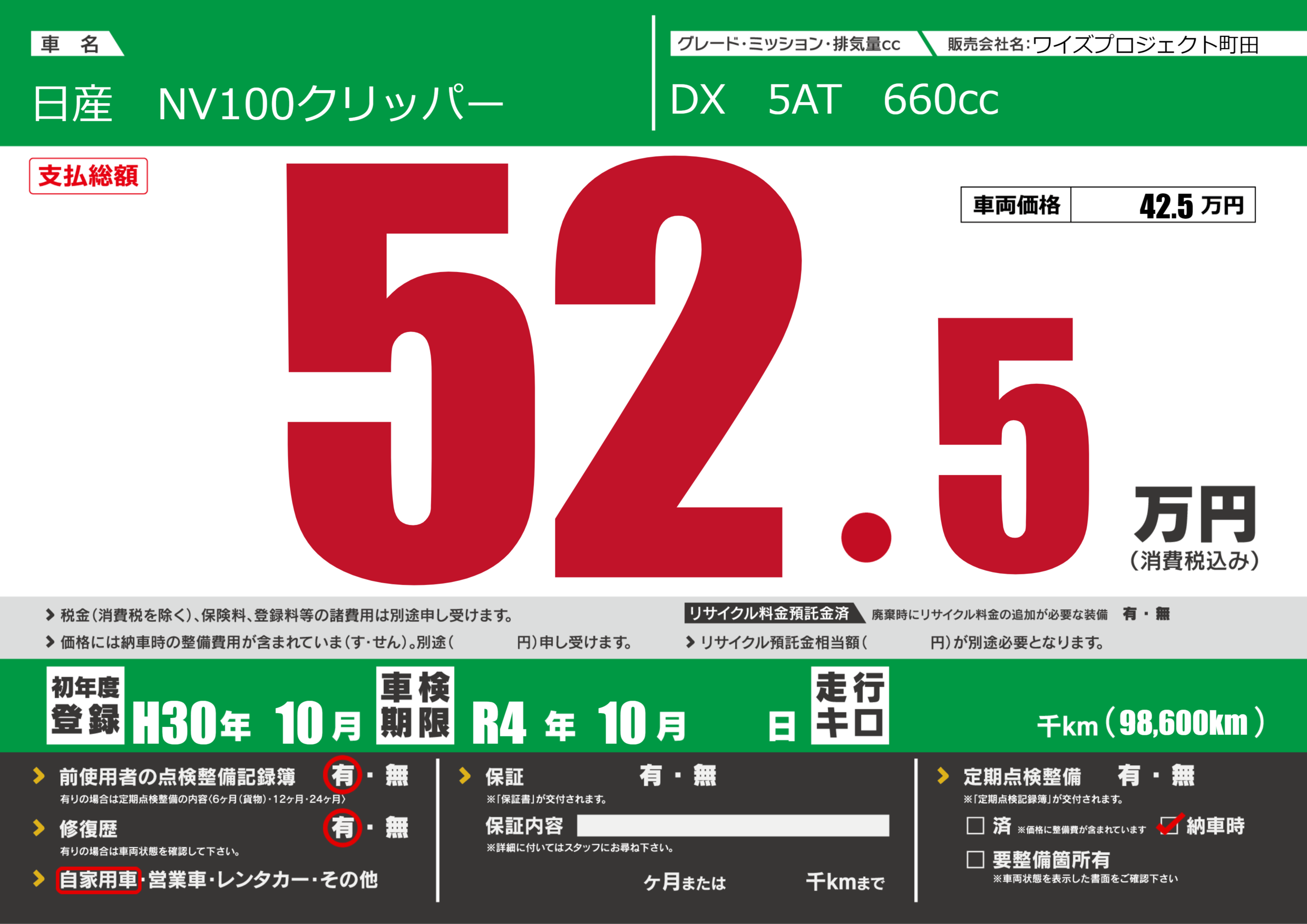 なし | 車検制限 | R4年10月---月 |