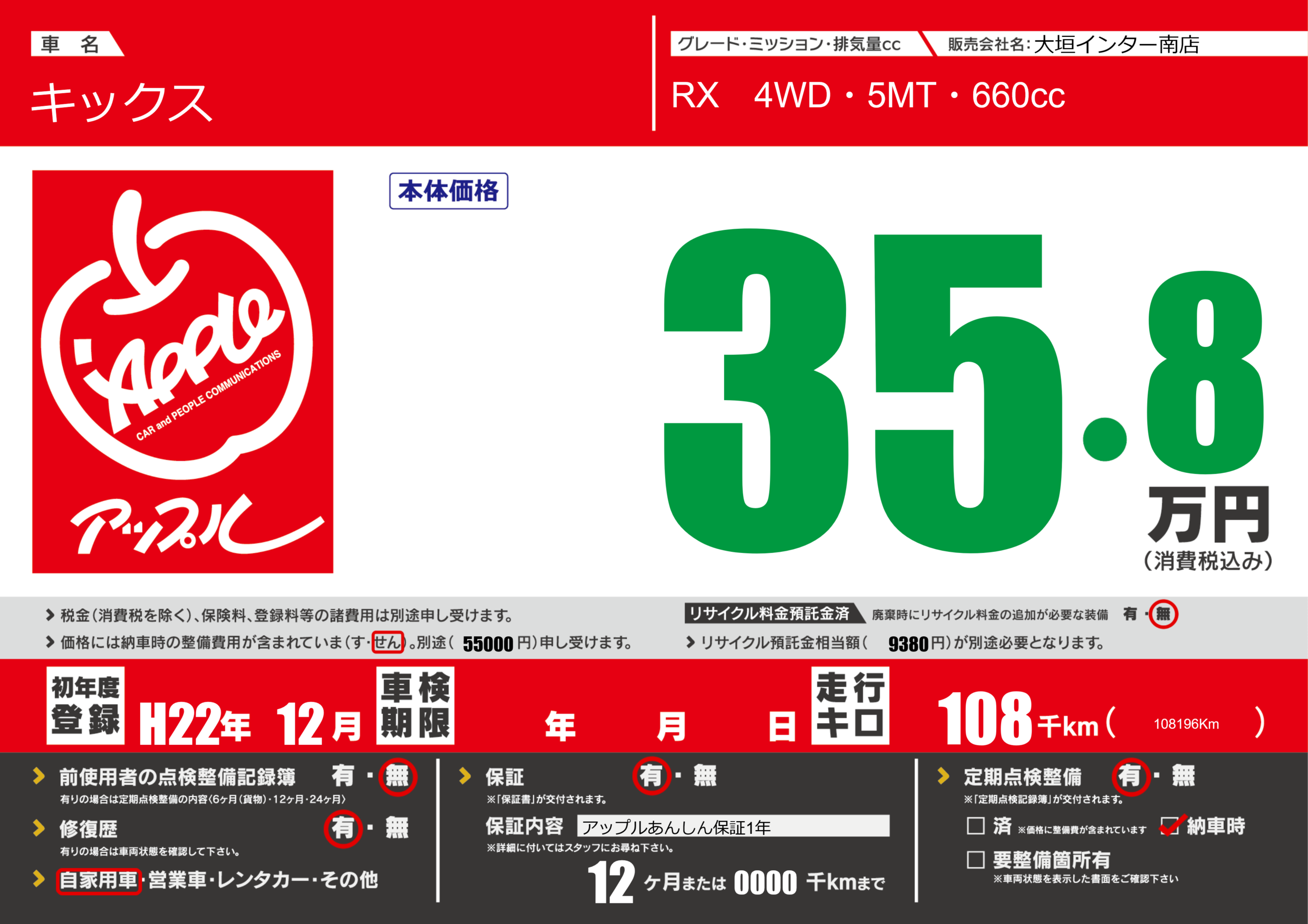 | 走行キロ | 10.8万km | 初年度登録 | H22年12月 |