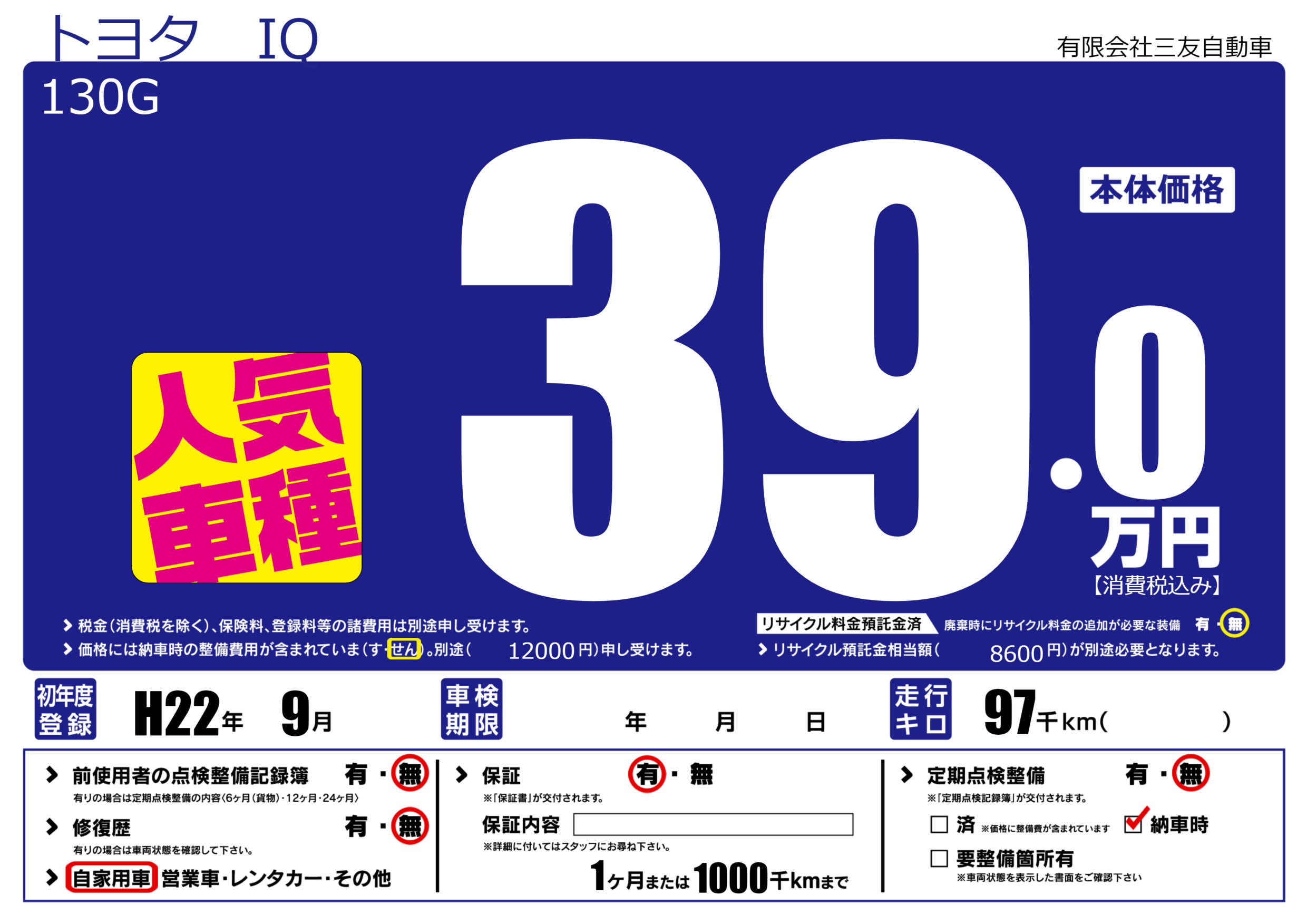 保証付き 保証内容(---) 1ヶ月または(1000)千kmまで |