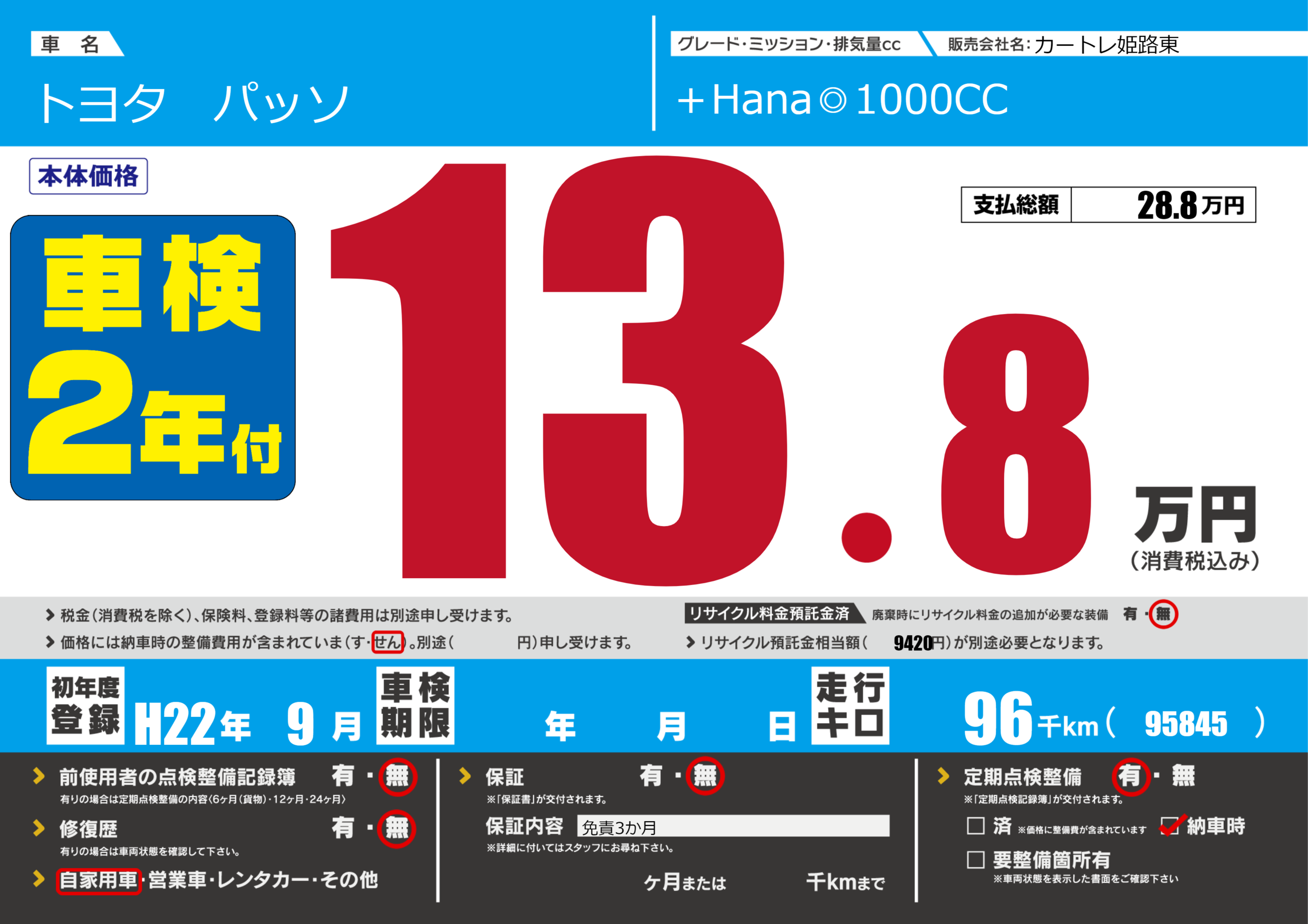 | 走行キロ | 9.6万km | 初年度登録 | H22年9月 |