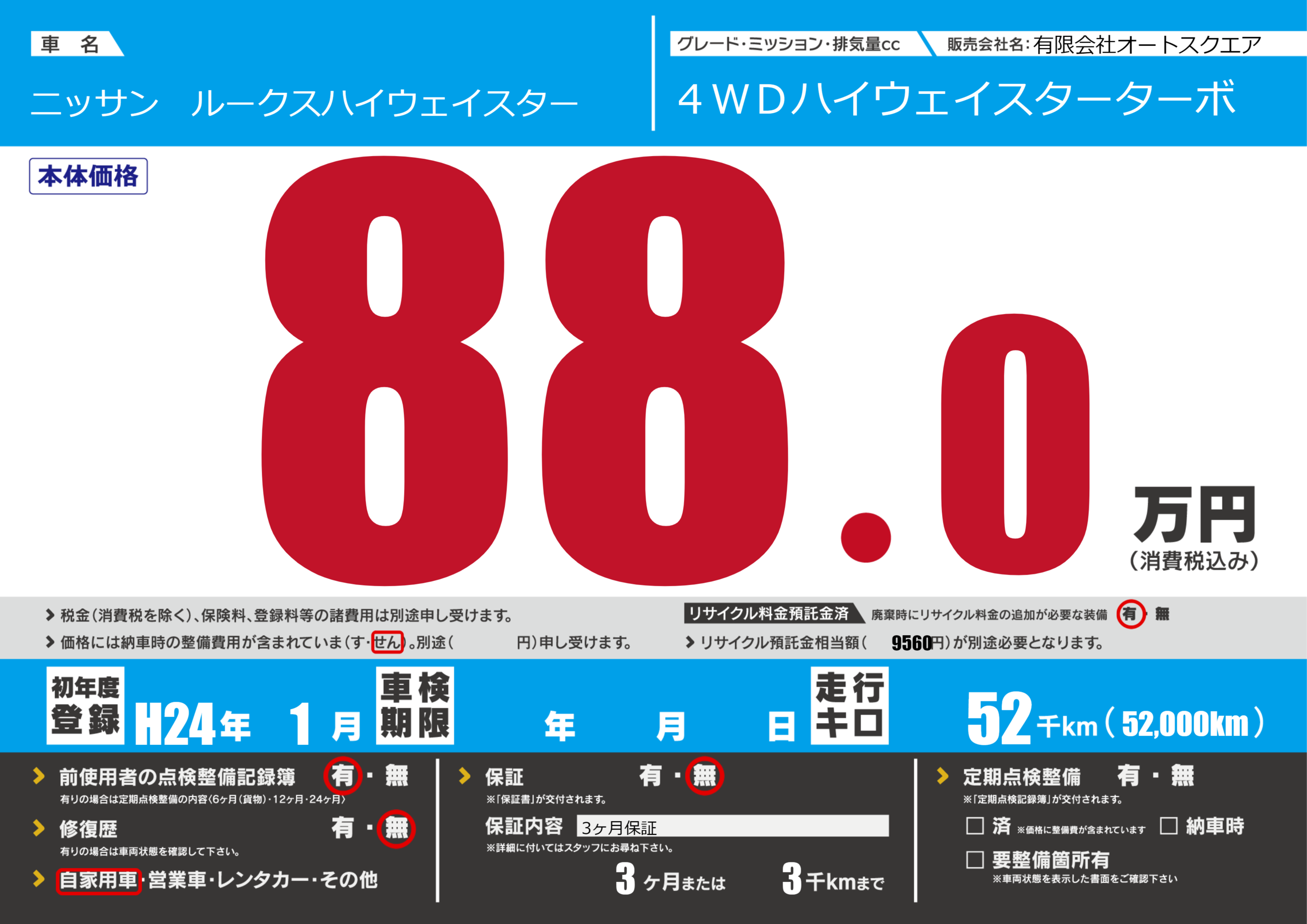 | 走行キロ | 5.2万km | 初年度登録 | H24年1月 |