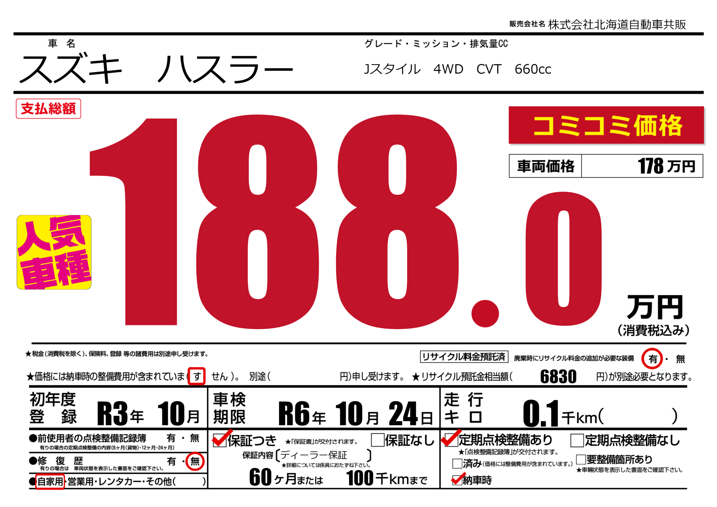 | 車名 | スズキ ハスラー | グレード ミッション 排気量 |