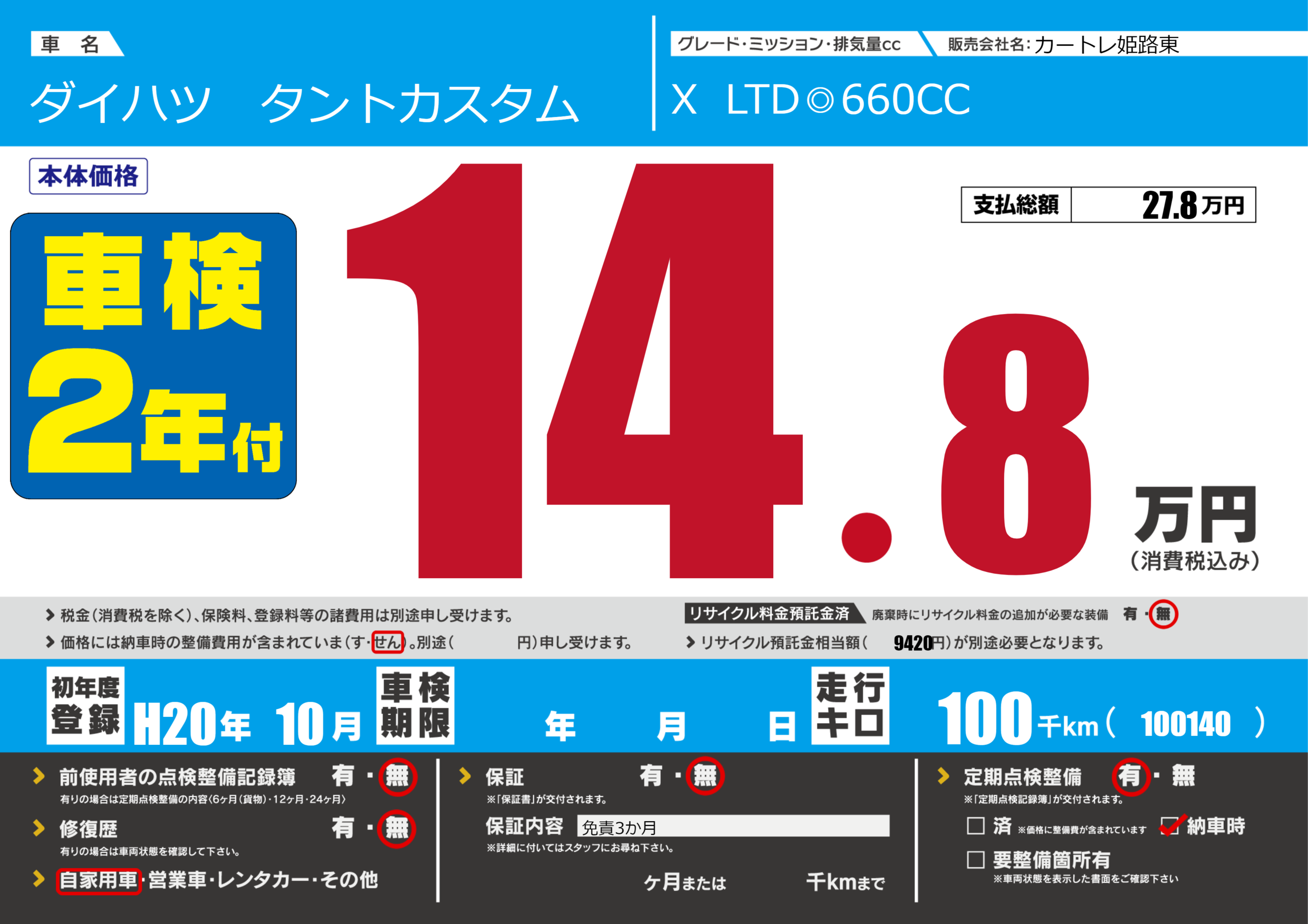 | 定期点検整備 | 定期点検整備あり 納車時あり | ||