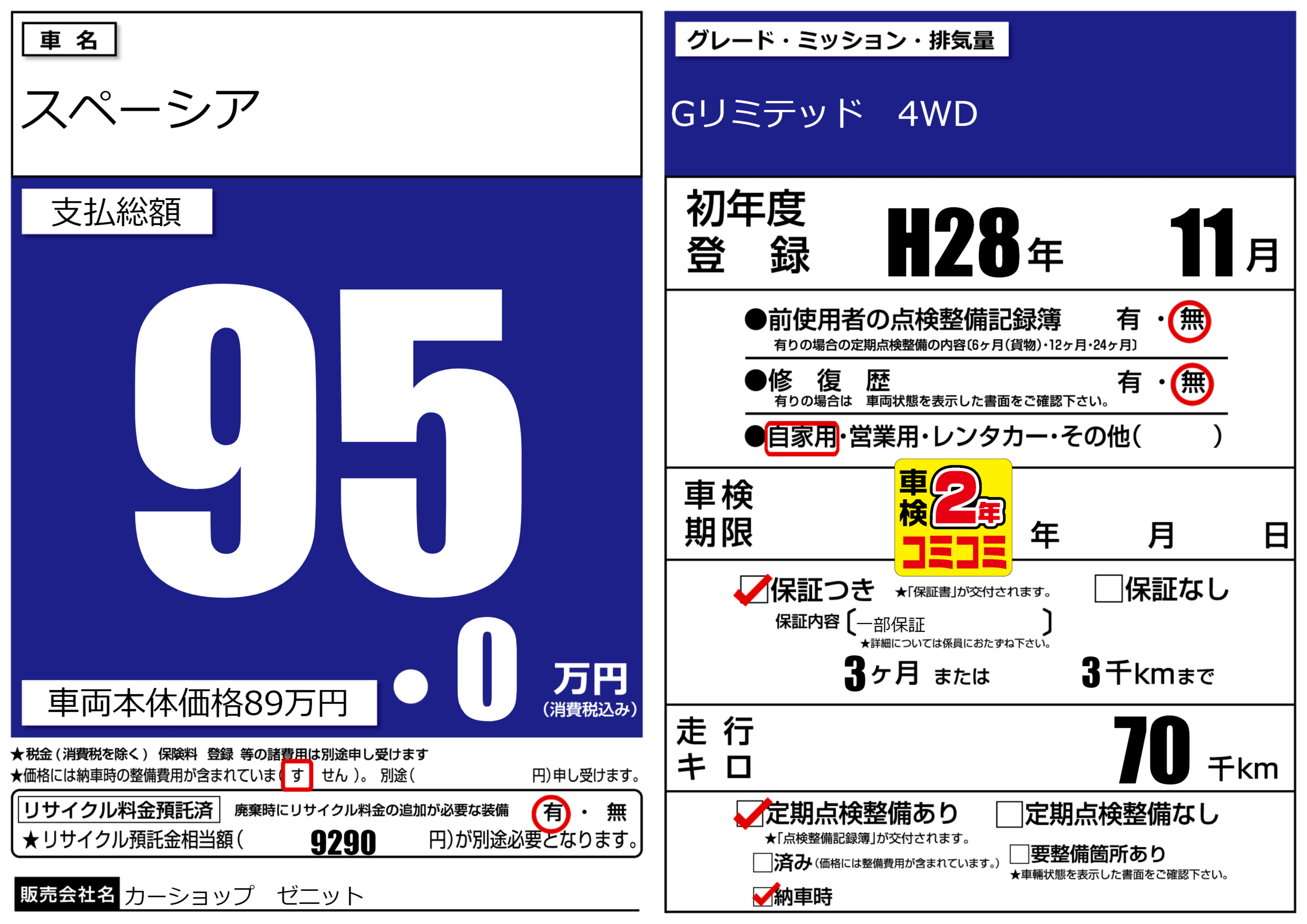 | 定期点検整備 | 定期点検整備あり 納車時あり | ||