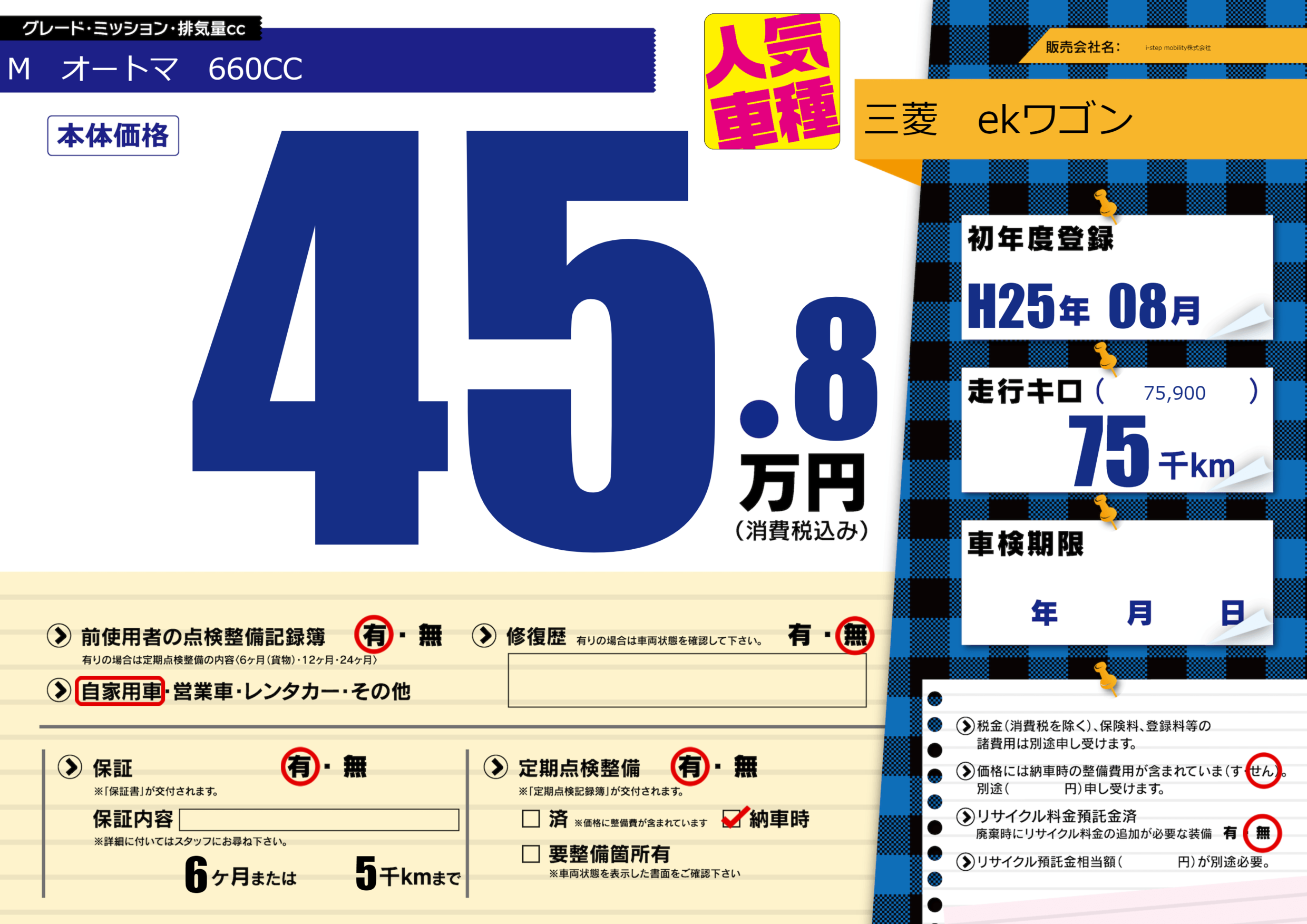 | 車名 | 三菱 ekワゴン | グレード ミッション 排気量 |
