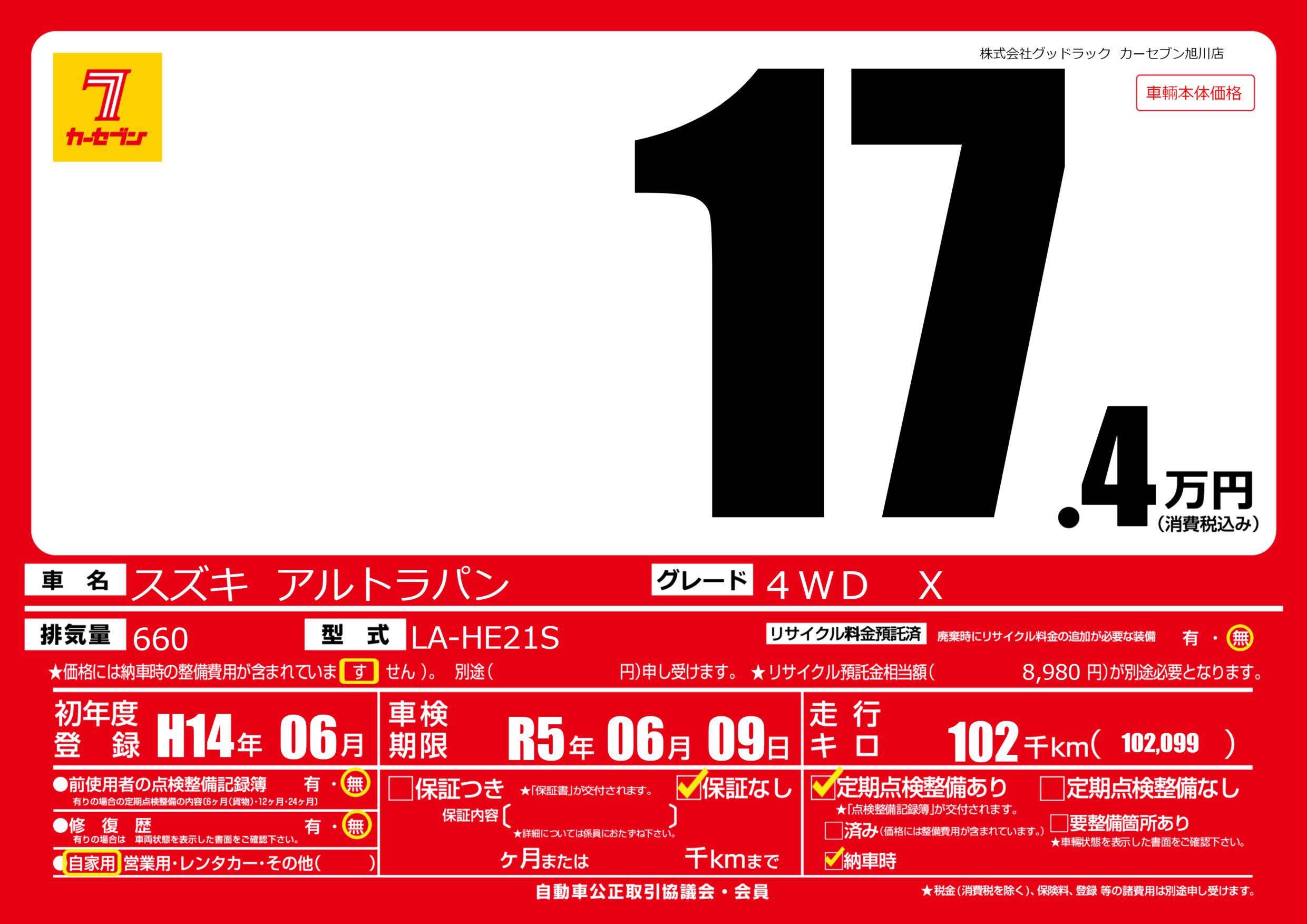 | 走行キロ | 10.2万km | 初年度登録 | H14年06月 |