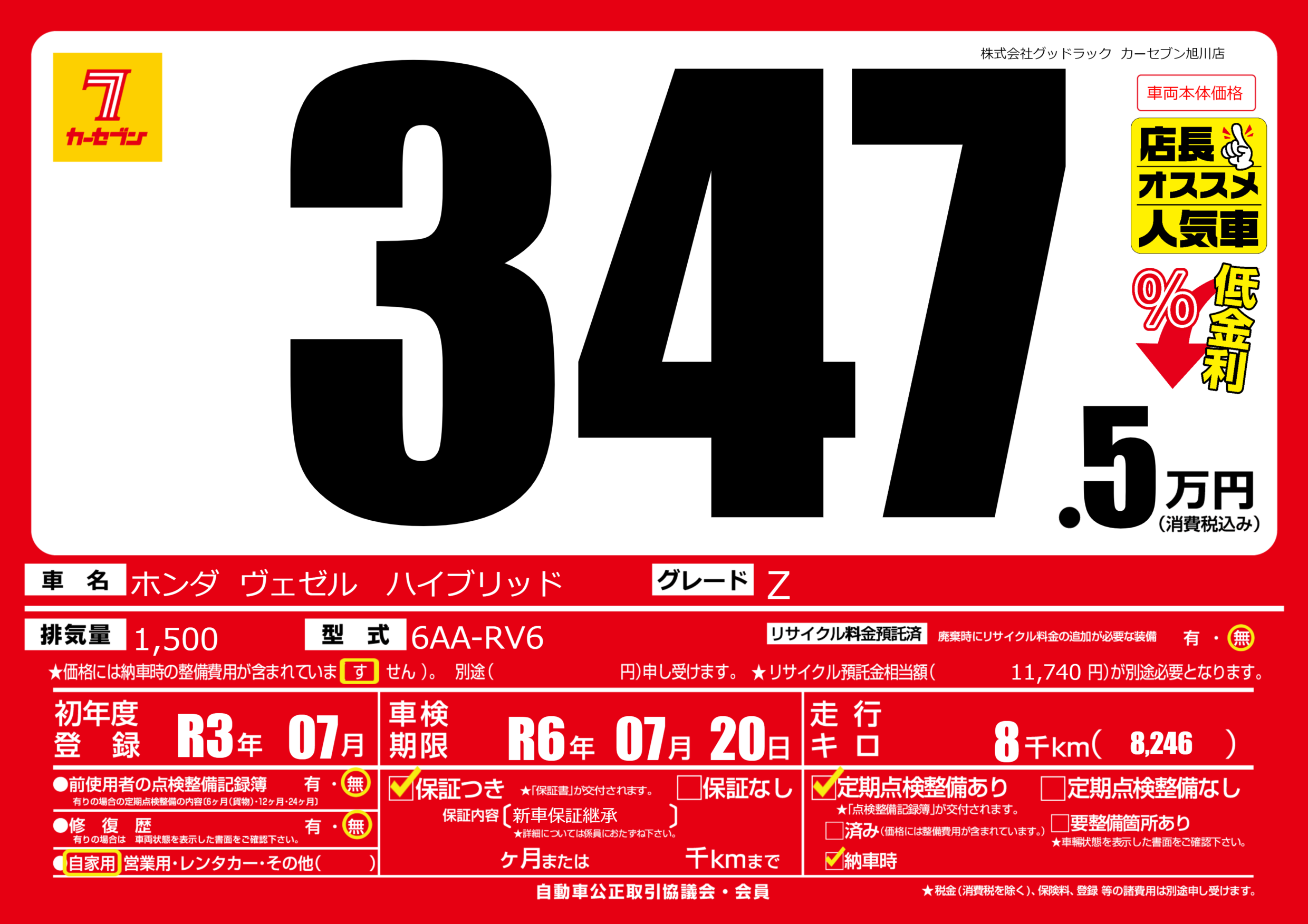 | 車名 | ホンダ ヴェゼル ハイブリッド | グレード ミッション 排気量 |