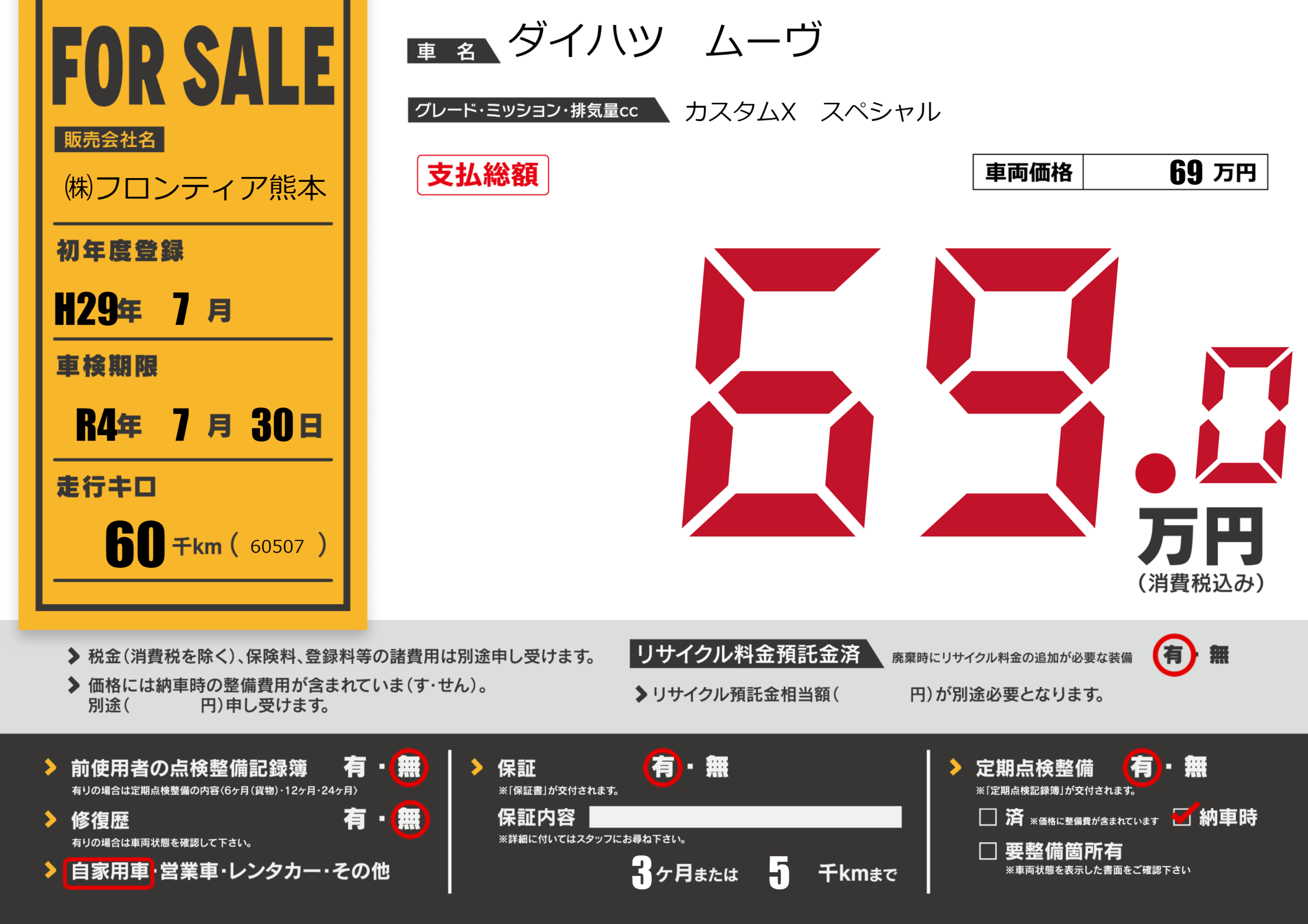| 走行キロ | 6万km | 初年度登録 | H29年7月 |