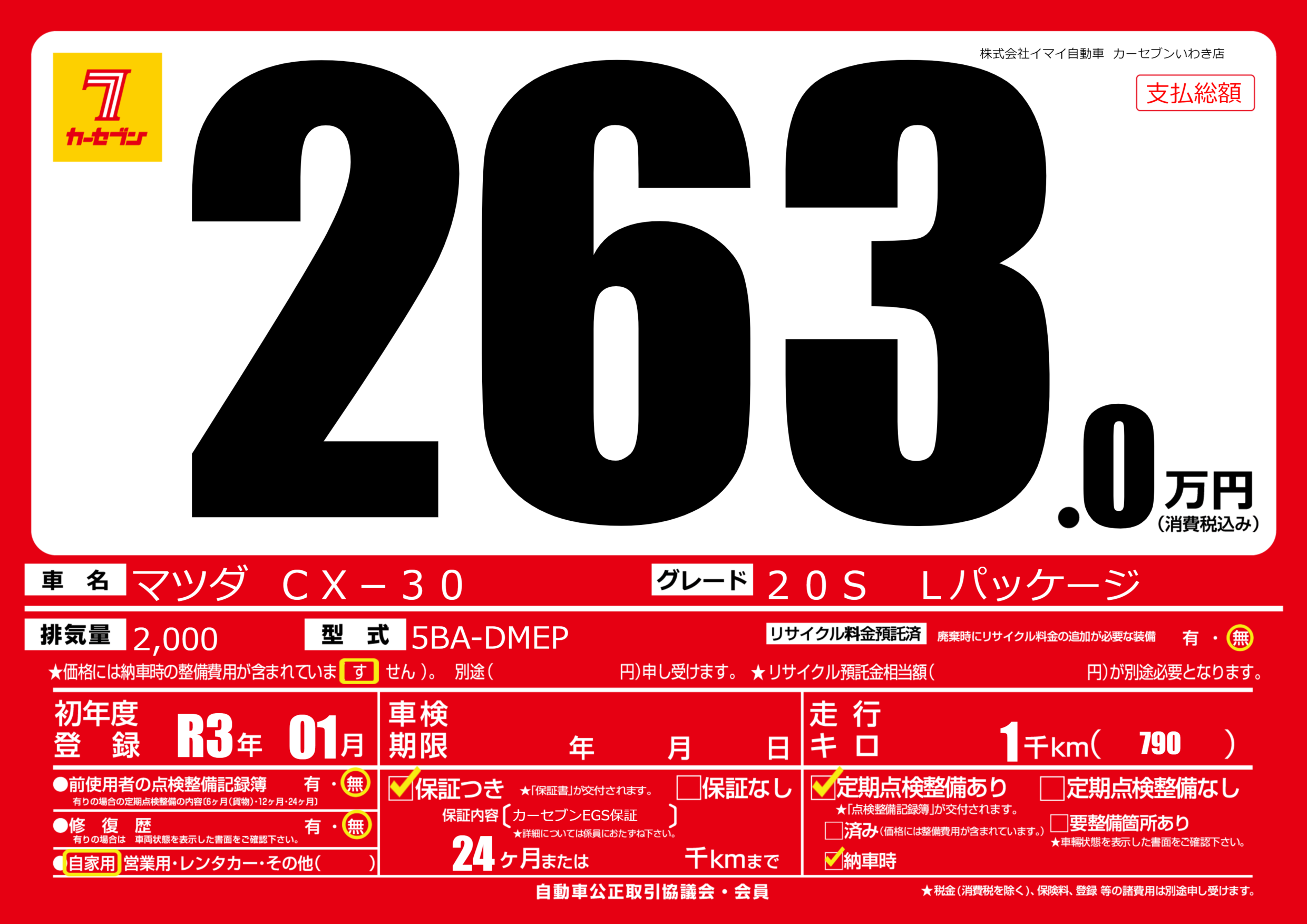 | 車名 | マツダ CX-30 | グレード ミッション 排気量 |
