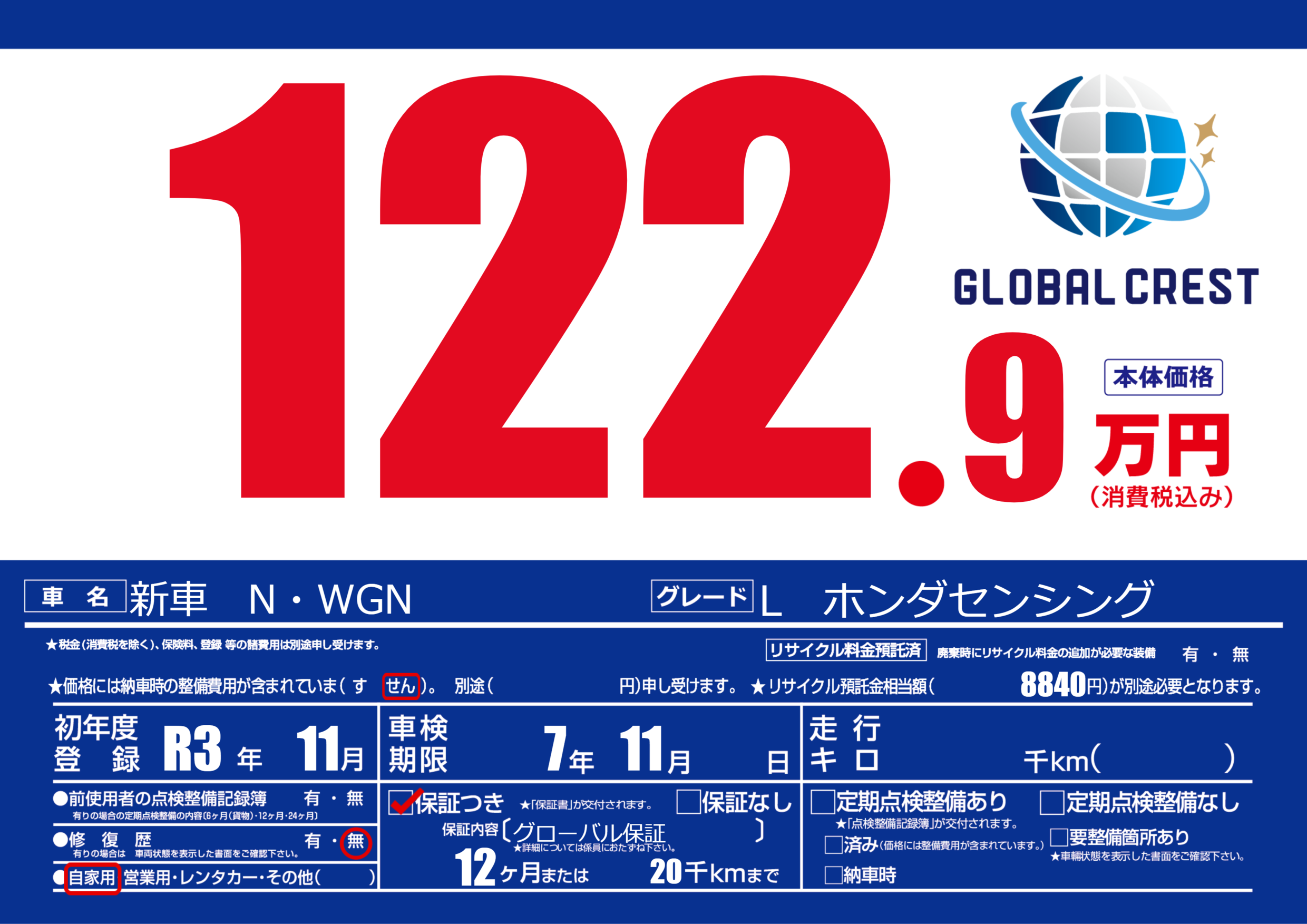 | 車名 | 新車 N・WGN | グレード ミッション 排気量 |
