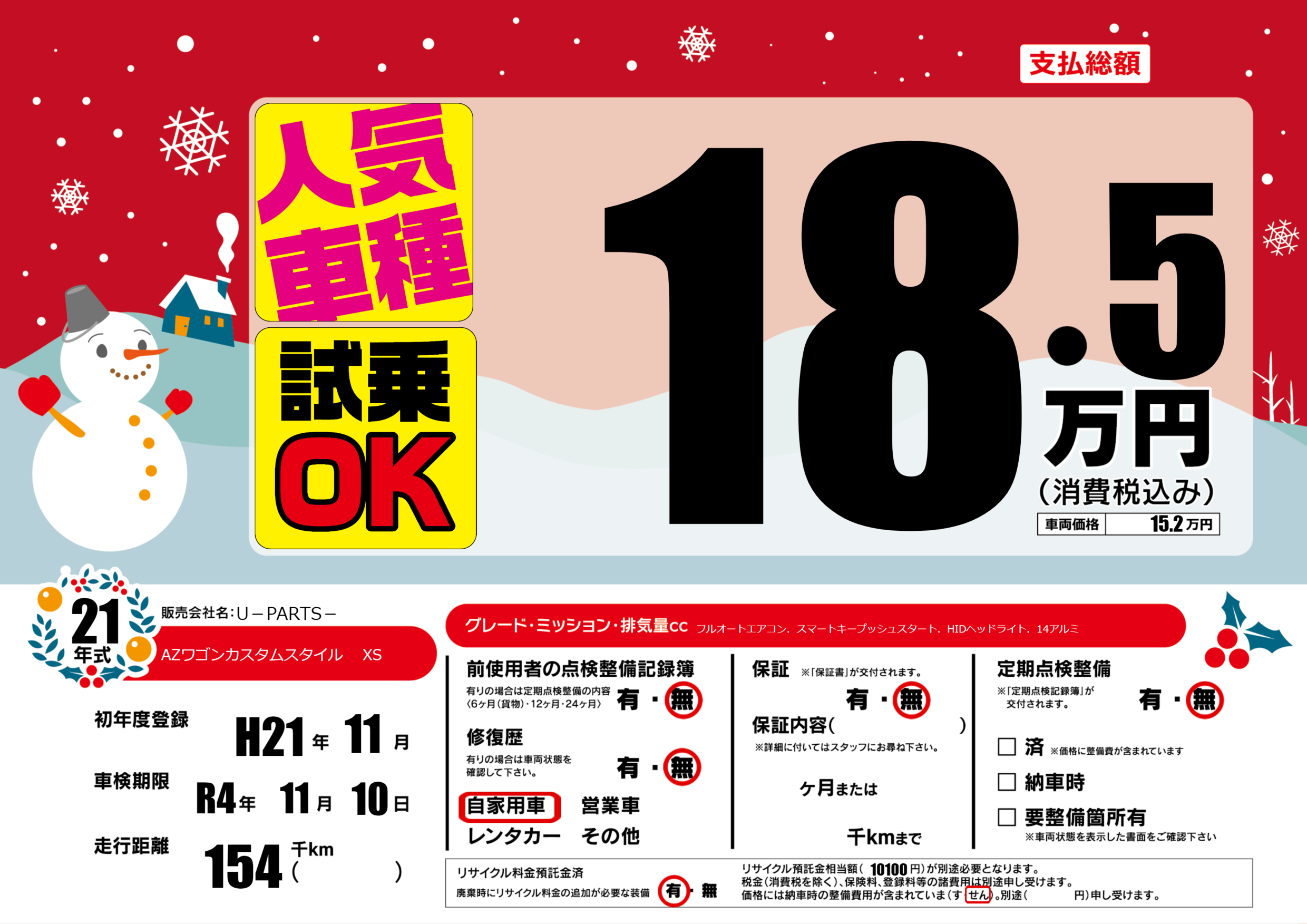 | 走行キロ | 15.4万km | 初年度登録 | H21年11月 |