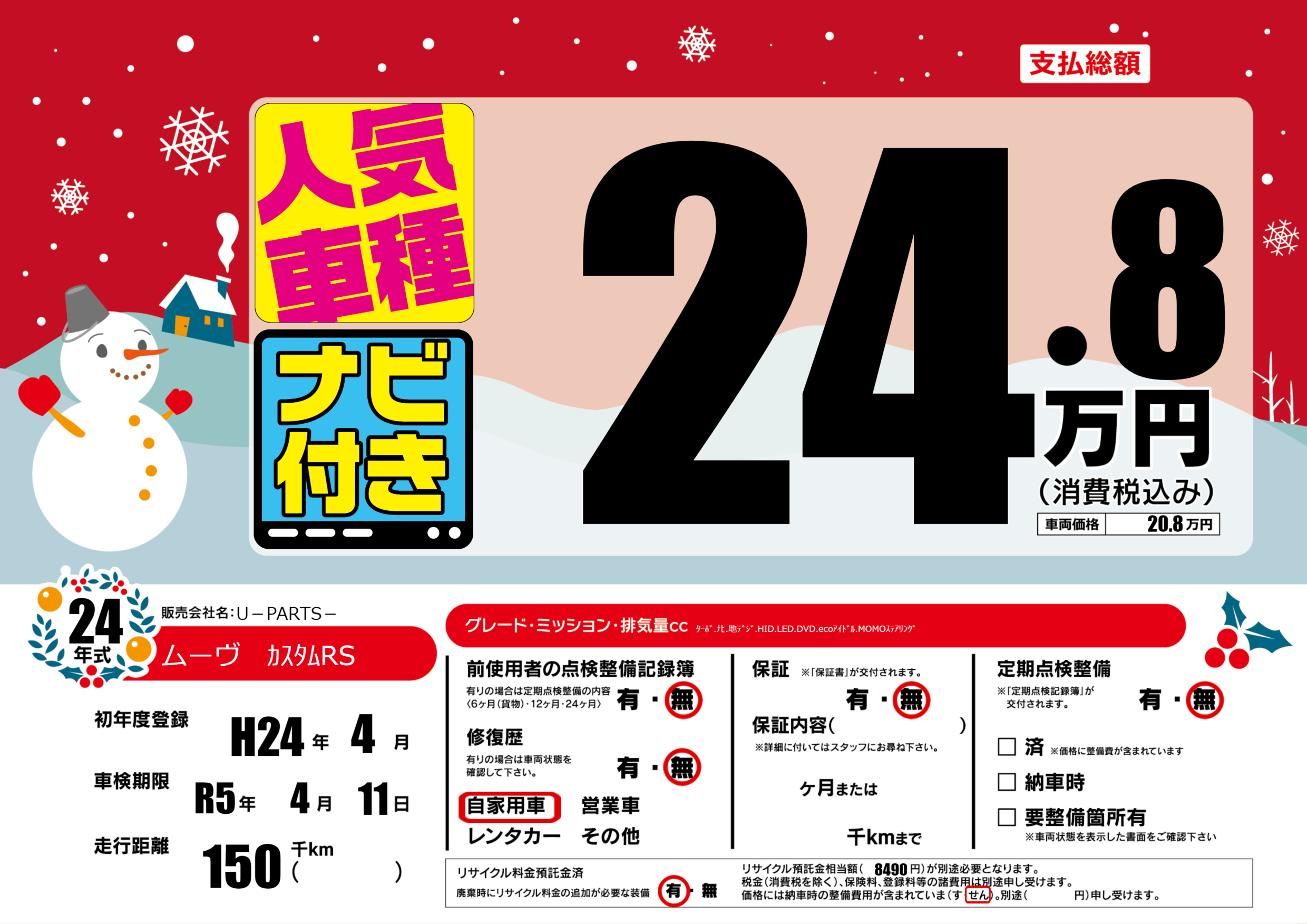 | 走行キロ | 15万km | 初年度登録 | H24年4月 |