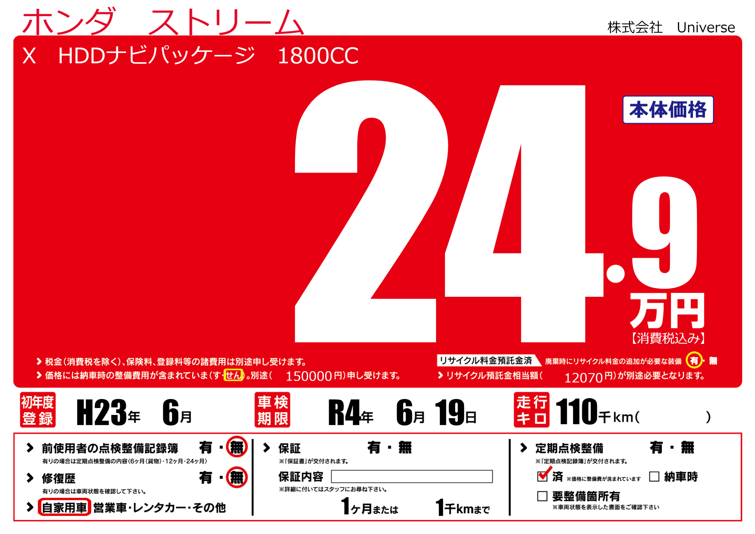 | 走行キロ | 11万km | 初年度登録 | H23年6月 |