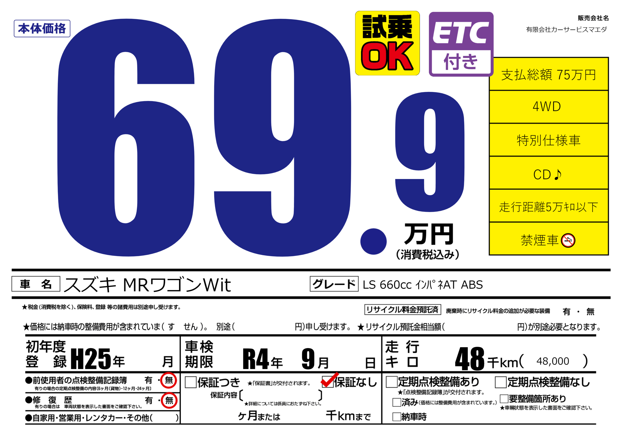 | 車名 | スズキ MRワゴンWit | グレード ミッション 排気量 |