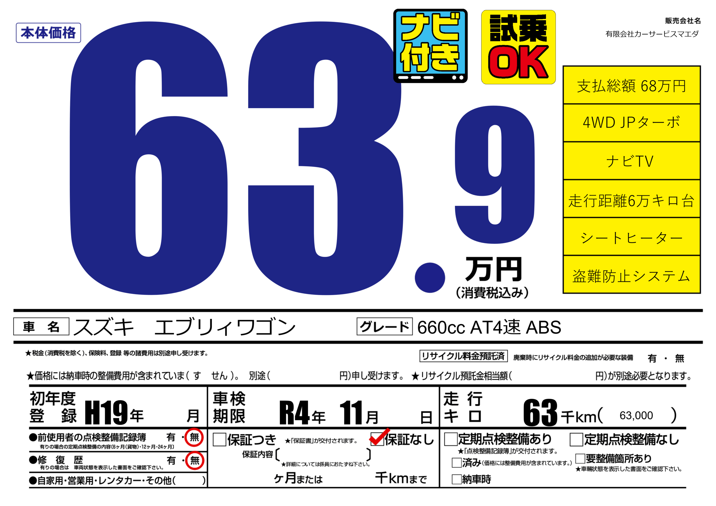 | 車名 | スズキ エブリィワゴン | グレード ミッション 排気量 |