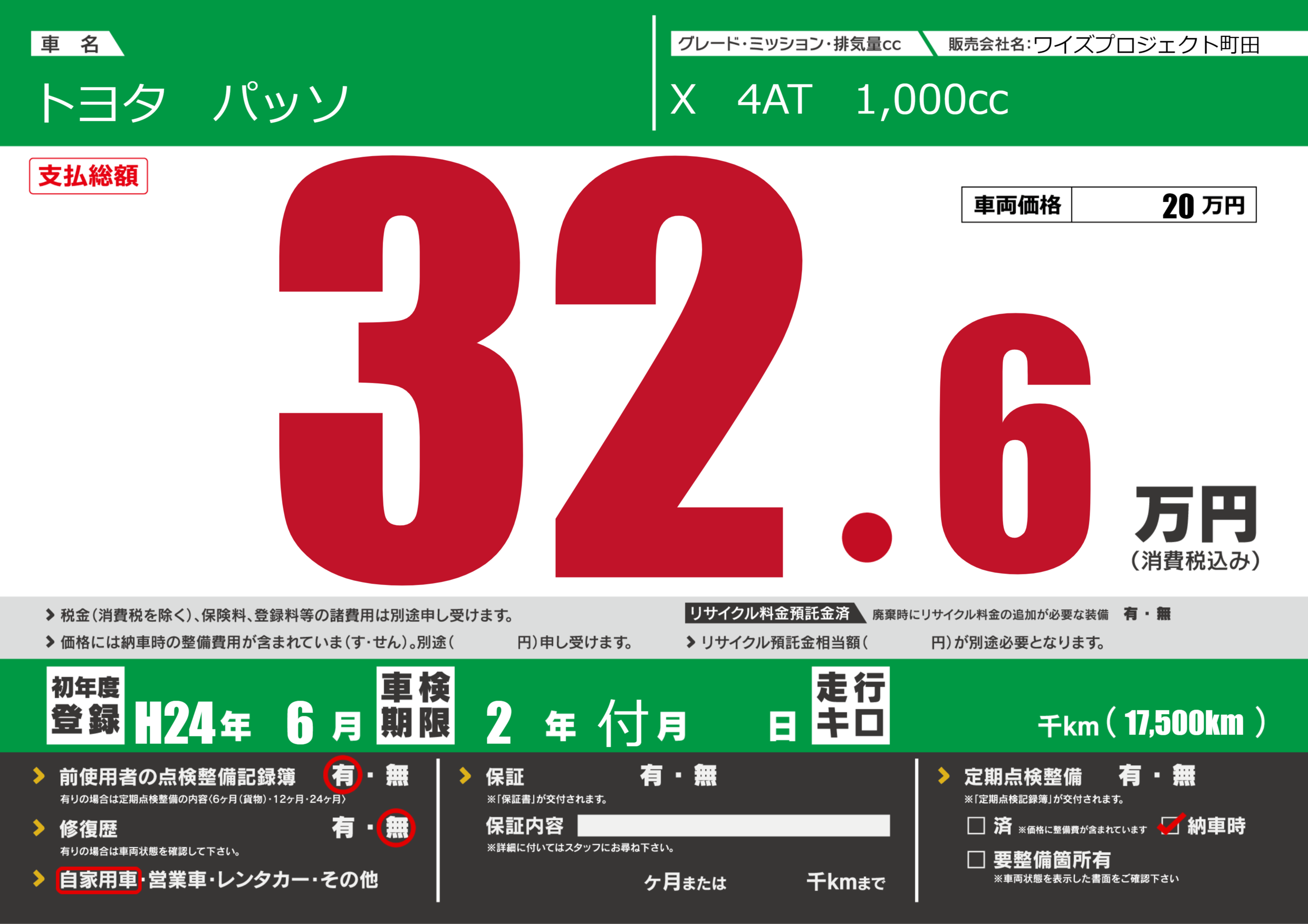 | 車名 | トヨタ パッソ | グレード ミッション 排気量 |