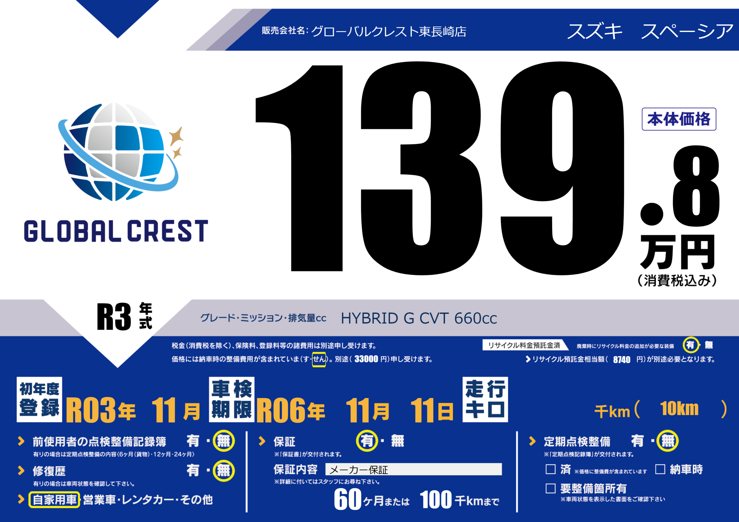| 車名 | スズキ スペーシア | グレード ミッション 排気量 |