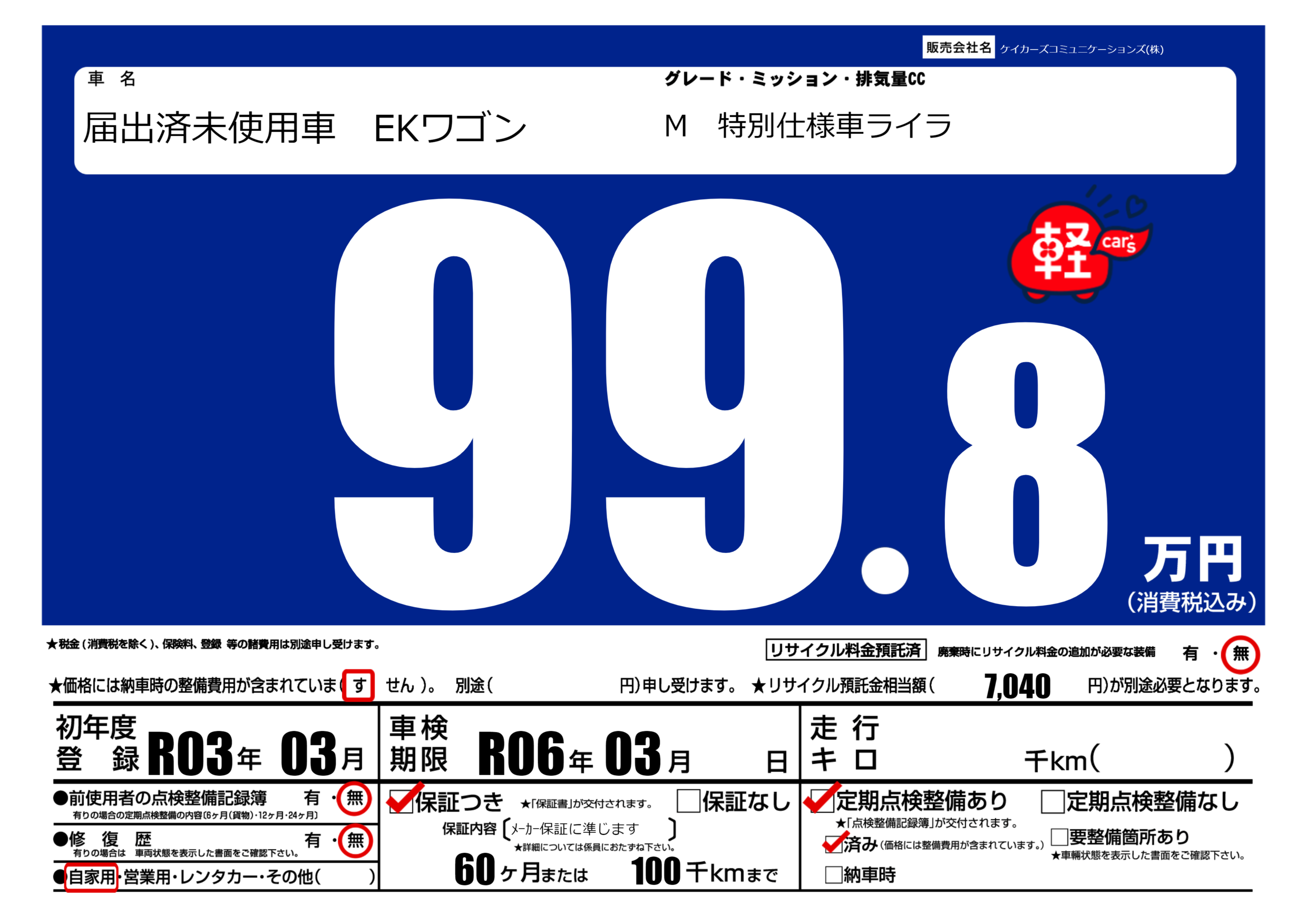 | 車名 | 届出済未使用車 EKワゴン | グレード ミッション 排気量 |