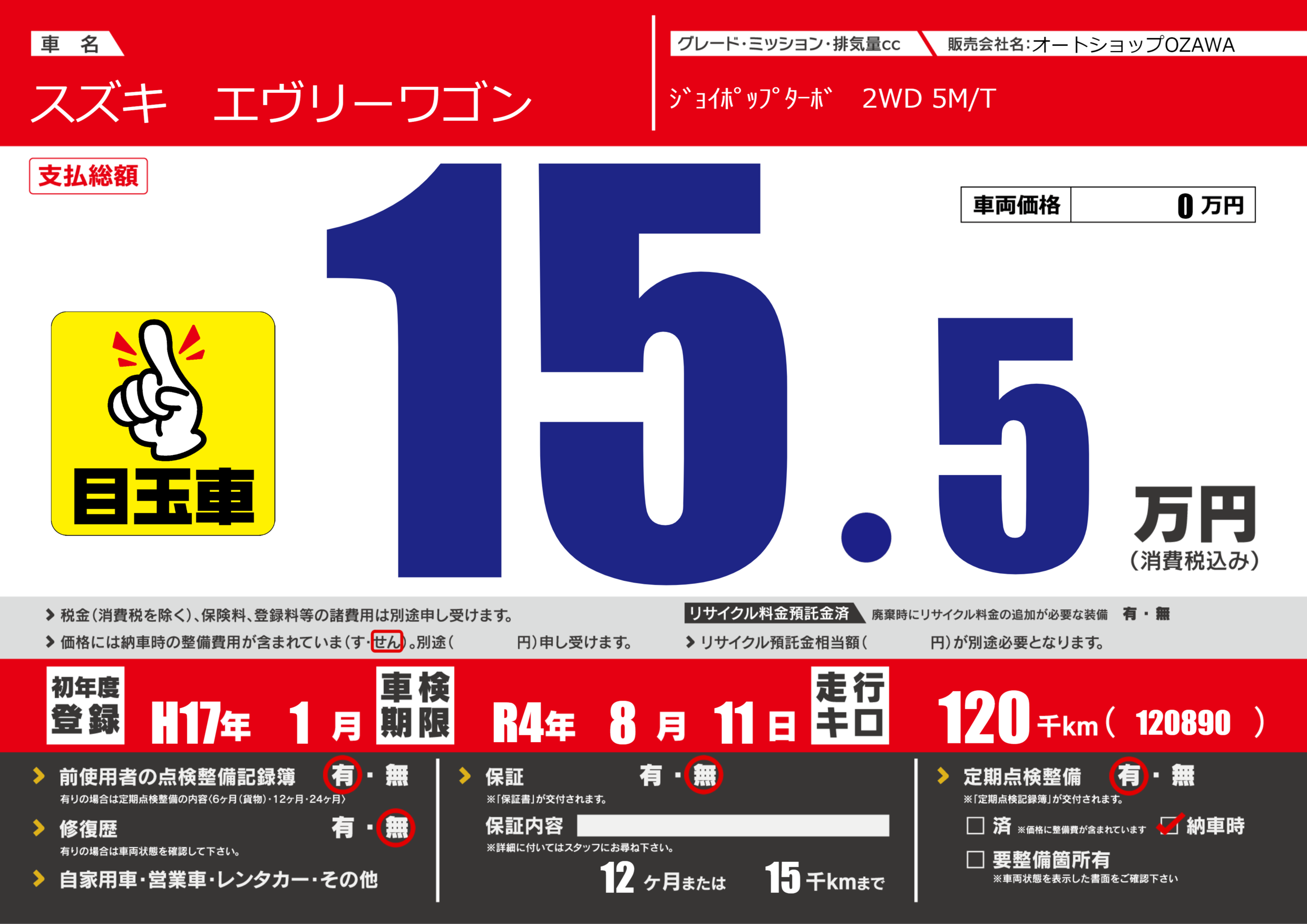 | 走行キロ | 12万km | 初年度登録 | H17年1月 |