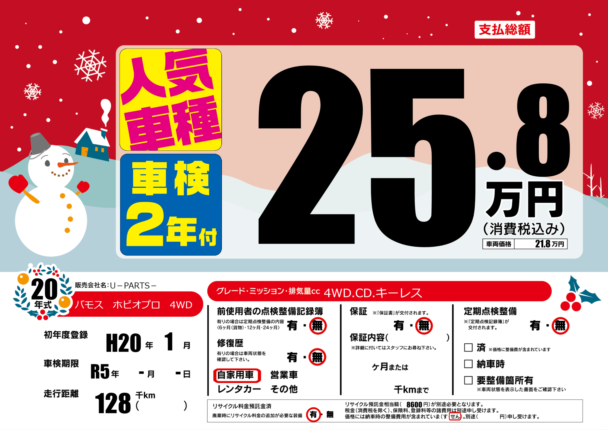 | 走行キロ | 12.8万km | 初年度登録 | H20年1月 |