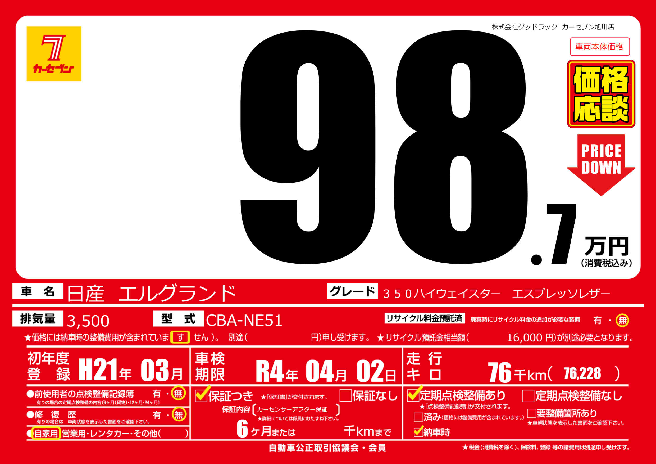| 走行キロ | 7.6万km | 初年度登録 | H21年03月 |