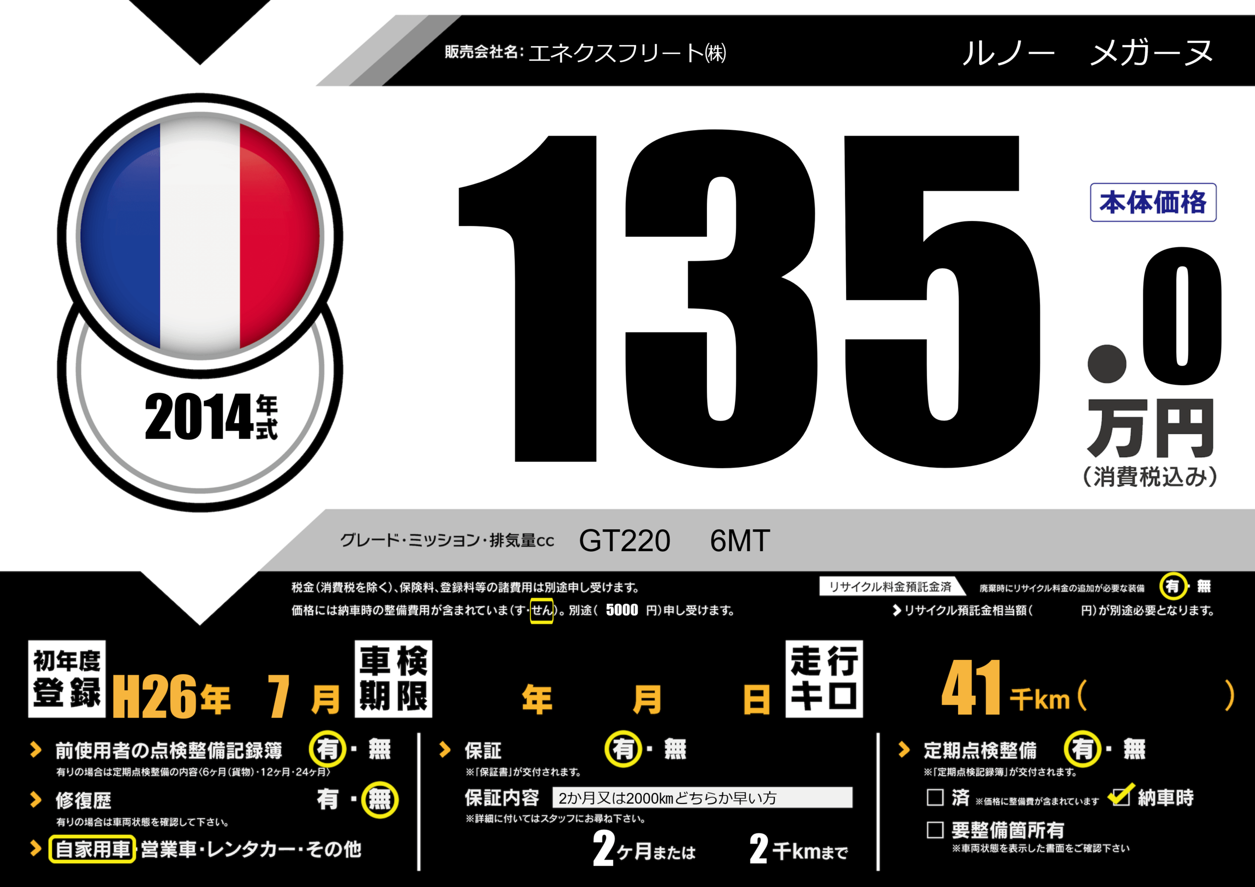 | 車名 | ルノー メガーヌ | グレード ミッション 排気量 |