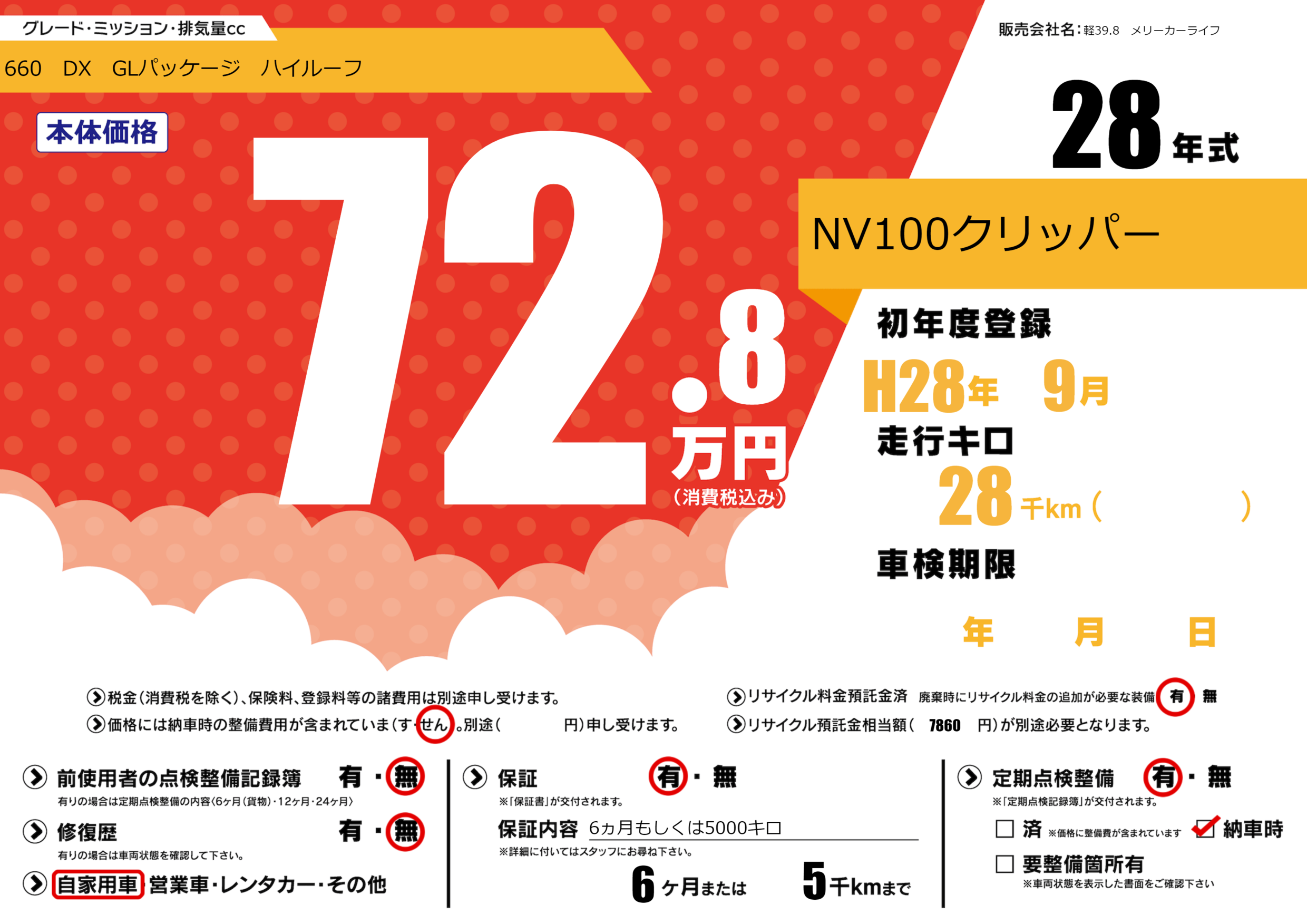 保証付き 保証内容(6ヵ月もしくは5000キロ) 6ヶ月または(5)千kmまで |