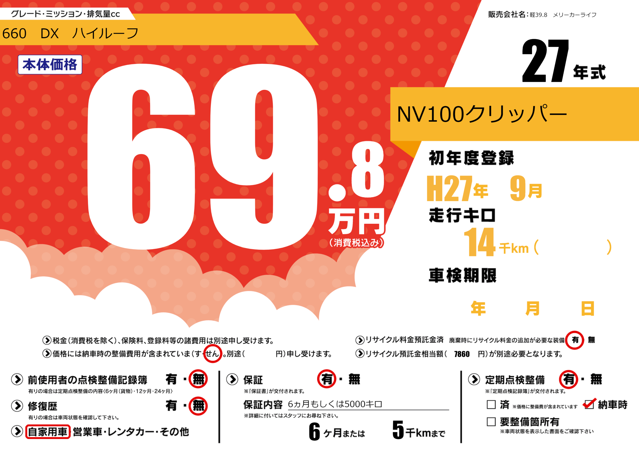 | 定期点検整備 | 定期点検整備あり 納車時あり | ||