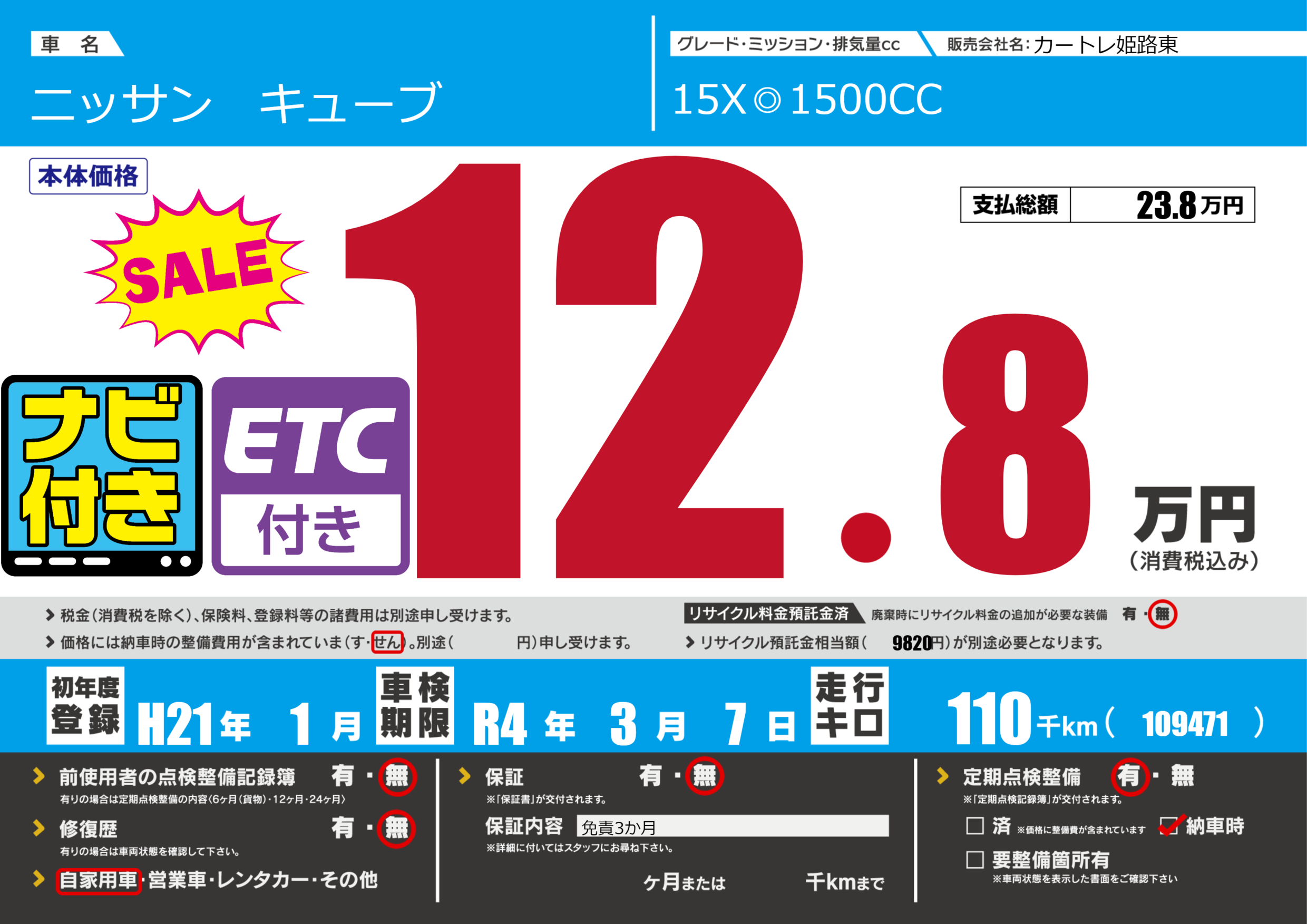| 車名 | ニッサン キューブ | グレード ミッション 排気量 |