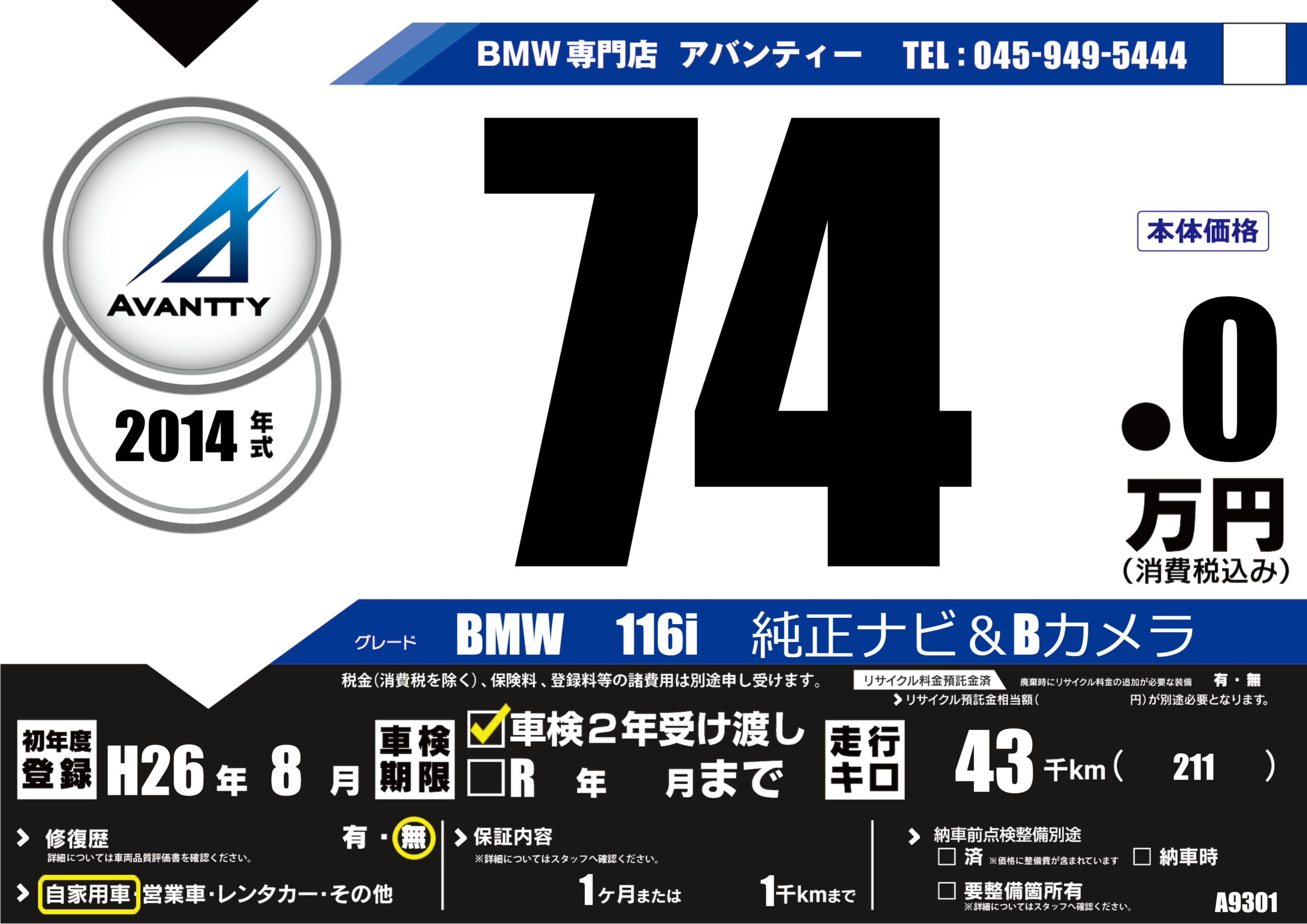 | 走行キロ | 4.3万km | 初年度登録 | H26年8月 |