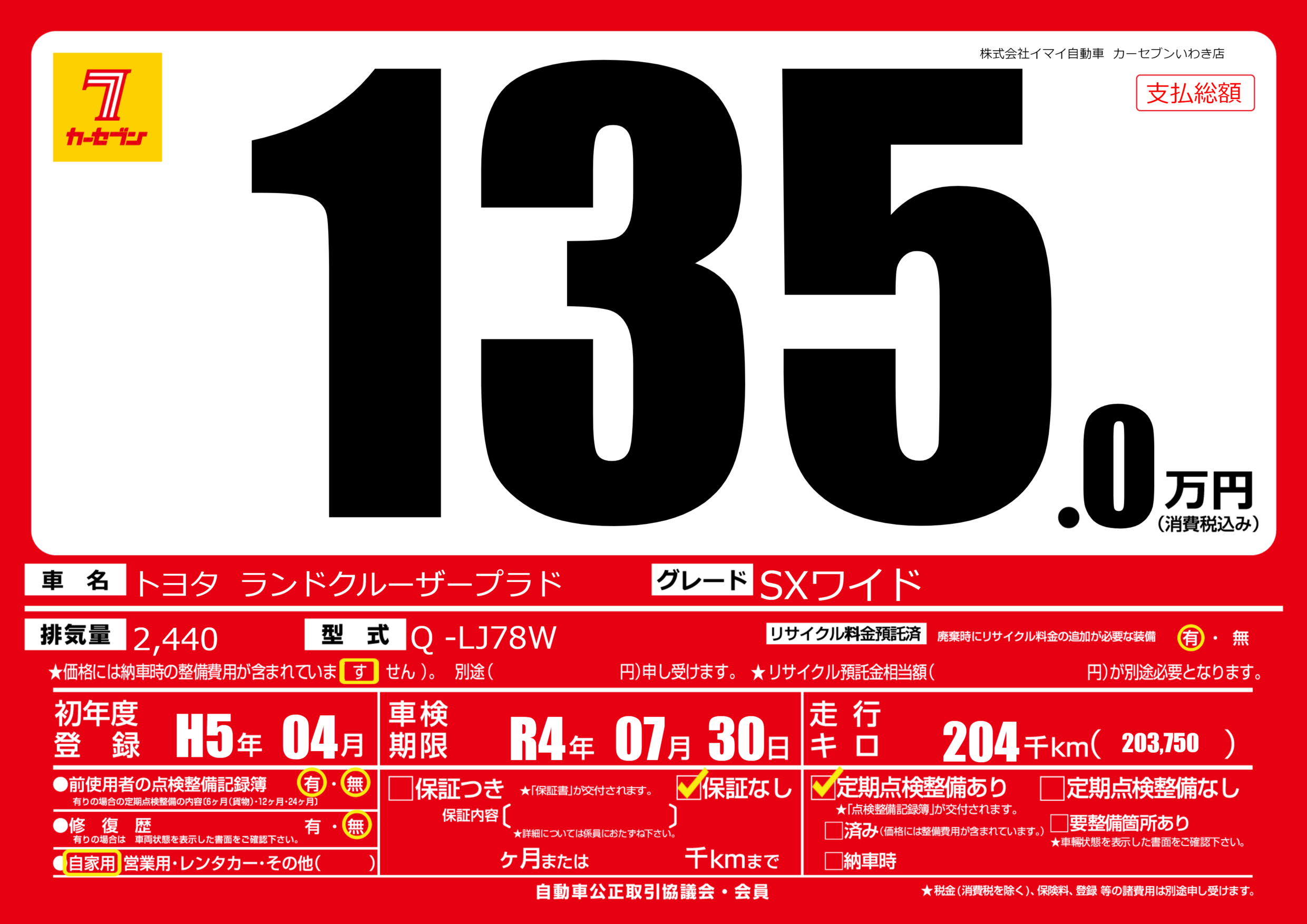 | 車検制限 | R4年 07月 30日 | ||