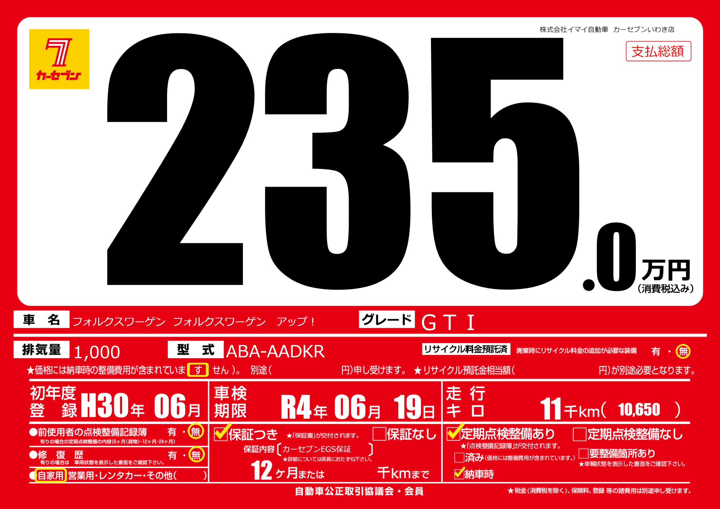 | 車名 | フォルクスワーゲン フォルクスワーゲン アップ! | グレード ミッション 排気量 |