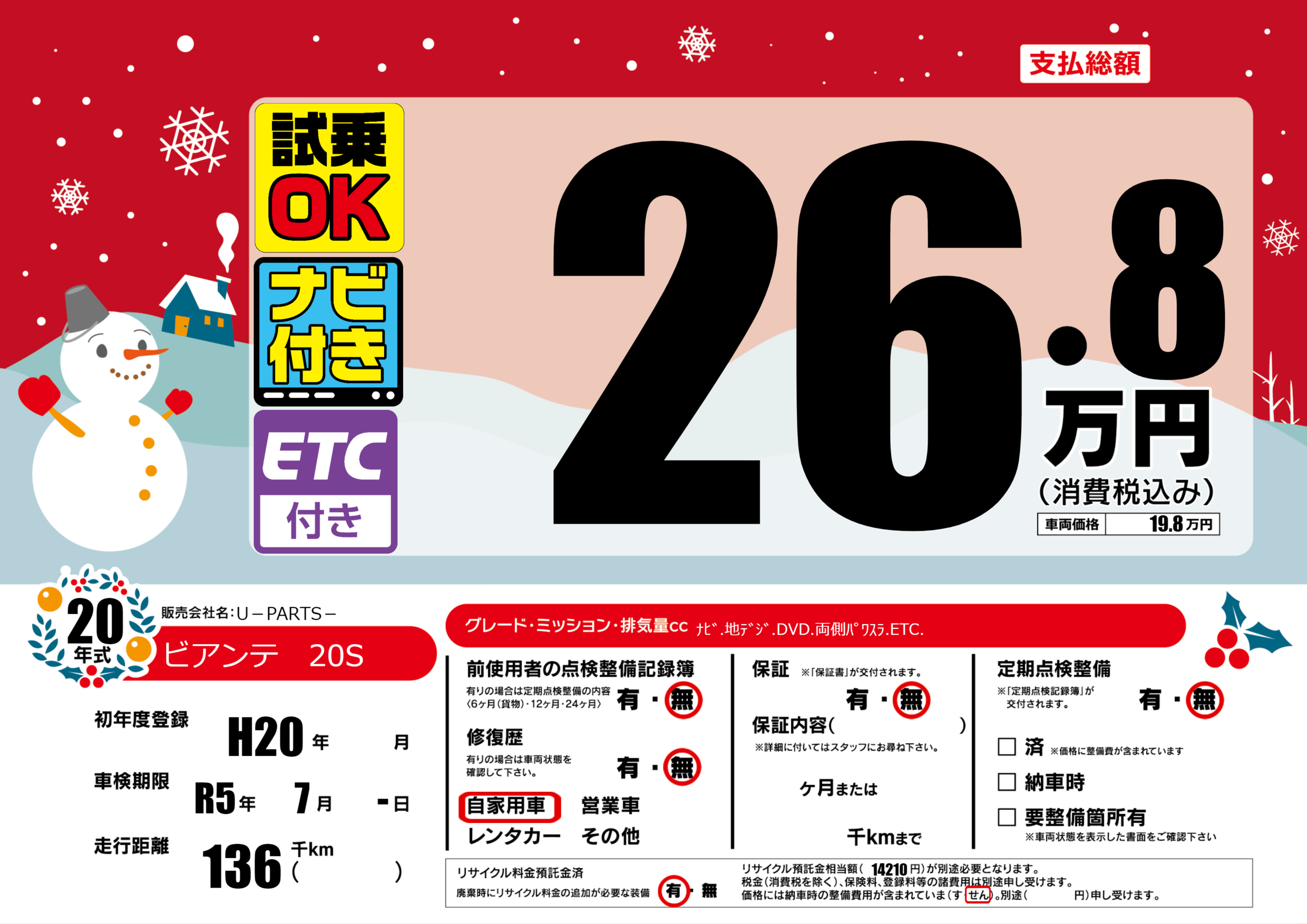 | 走行キロ | 13.6万km | 初年度登録 | H20年---月 |